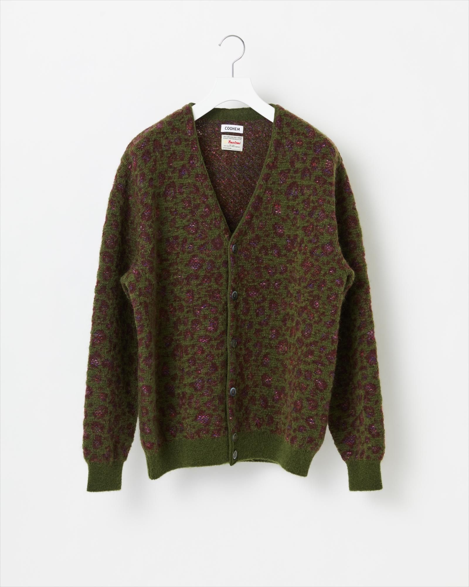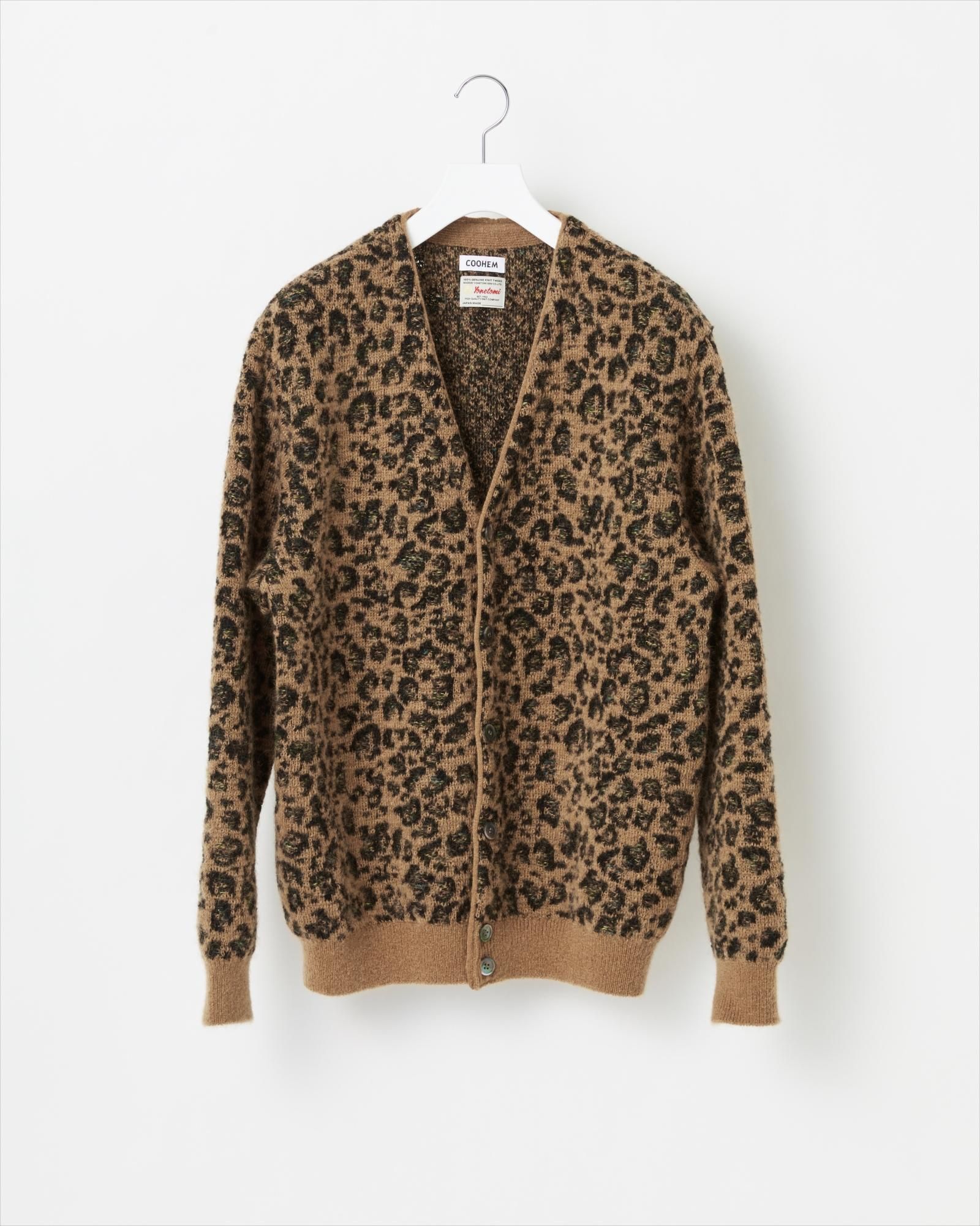 ジャガード編みで表現した、レオパード柄ニット。毛足の長いモヘヤをベースに、ウールのブークレ、カスリ染めのシルクを使用し、柄に奥行きを持たせています。ゆとりのあるシルエットで、アウターの代わりにもなるアイテムです。