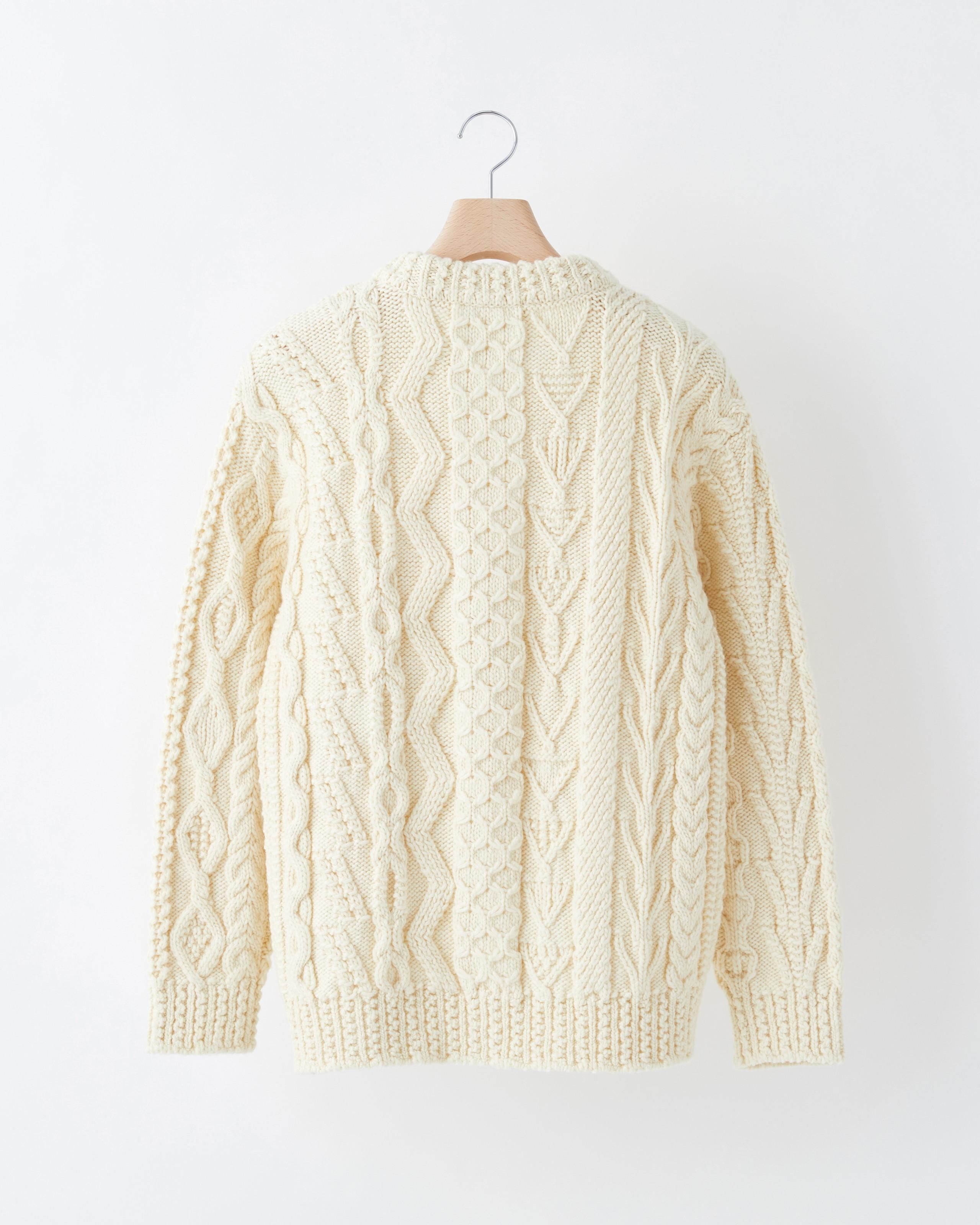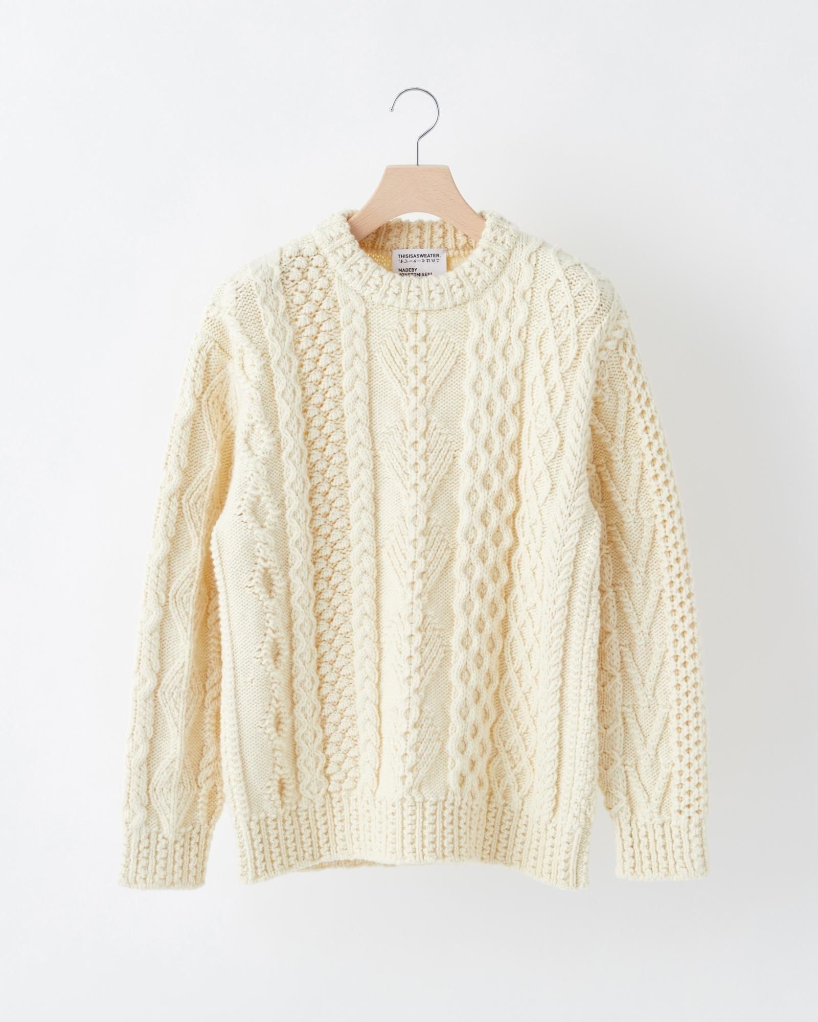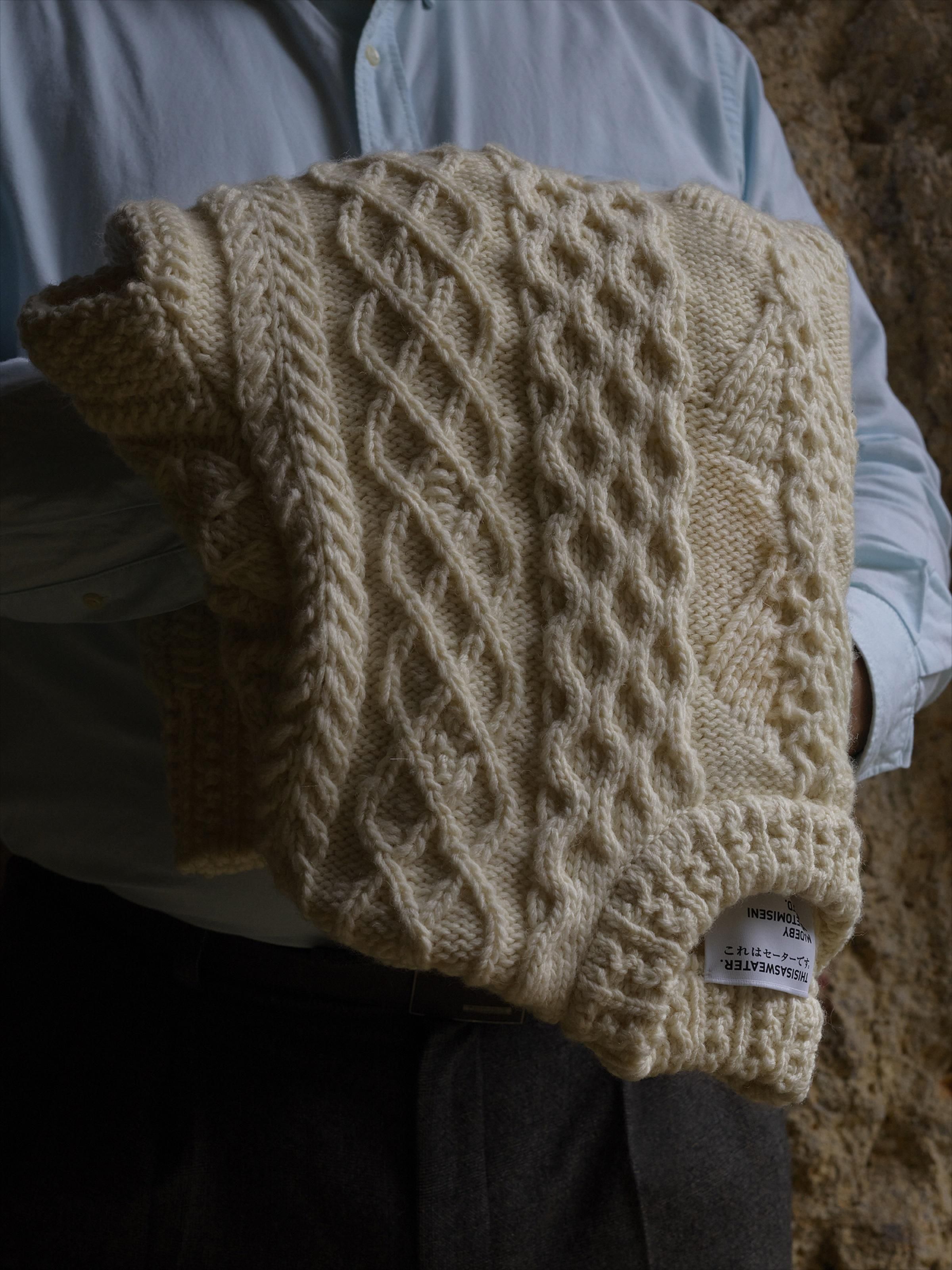 「アラン諸島最高のハンドニッター」と称された故モーリン・ニ・ドゥンネルが遺した「21世紀最高のアランセーター」を見本とし、老舗ニットファクトリーとしての技術と、膨大な時間を注いで完成させたアランセーター。 30種類の異なる編み柄で構成されたセーターは、360度違った表情を見せます。ハンドニット由来の、美しい柄の陰影を際立たせ、尚且つ柔らかな肌触りも実現させるため、産地と繊維長の異なるウールをブレンドし、オリジナルの糸を開発。 「セーターとは何か?」を問うブランド THISISASWEATER.として、アランセーターに刻まれた歴史と伝統、人々の物語に敬意を払い、たった1枚のセーターのために捧げる惜しむことのない愛を試されながら、ひとつの答えに辿り着きました。