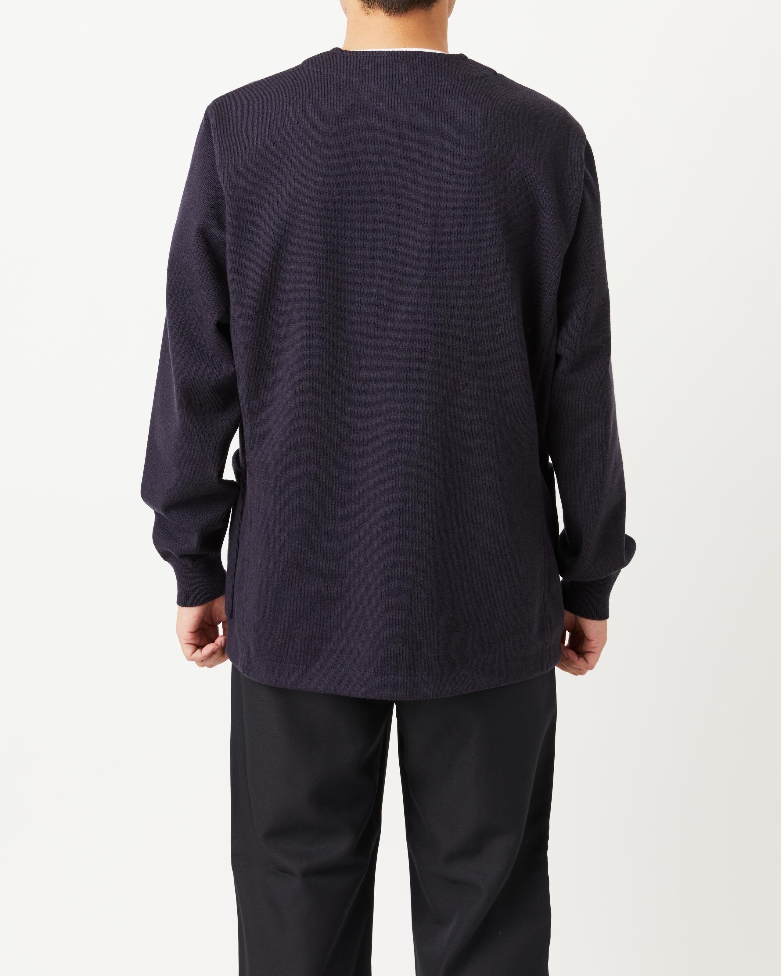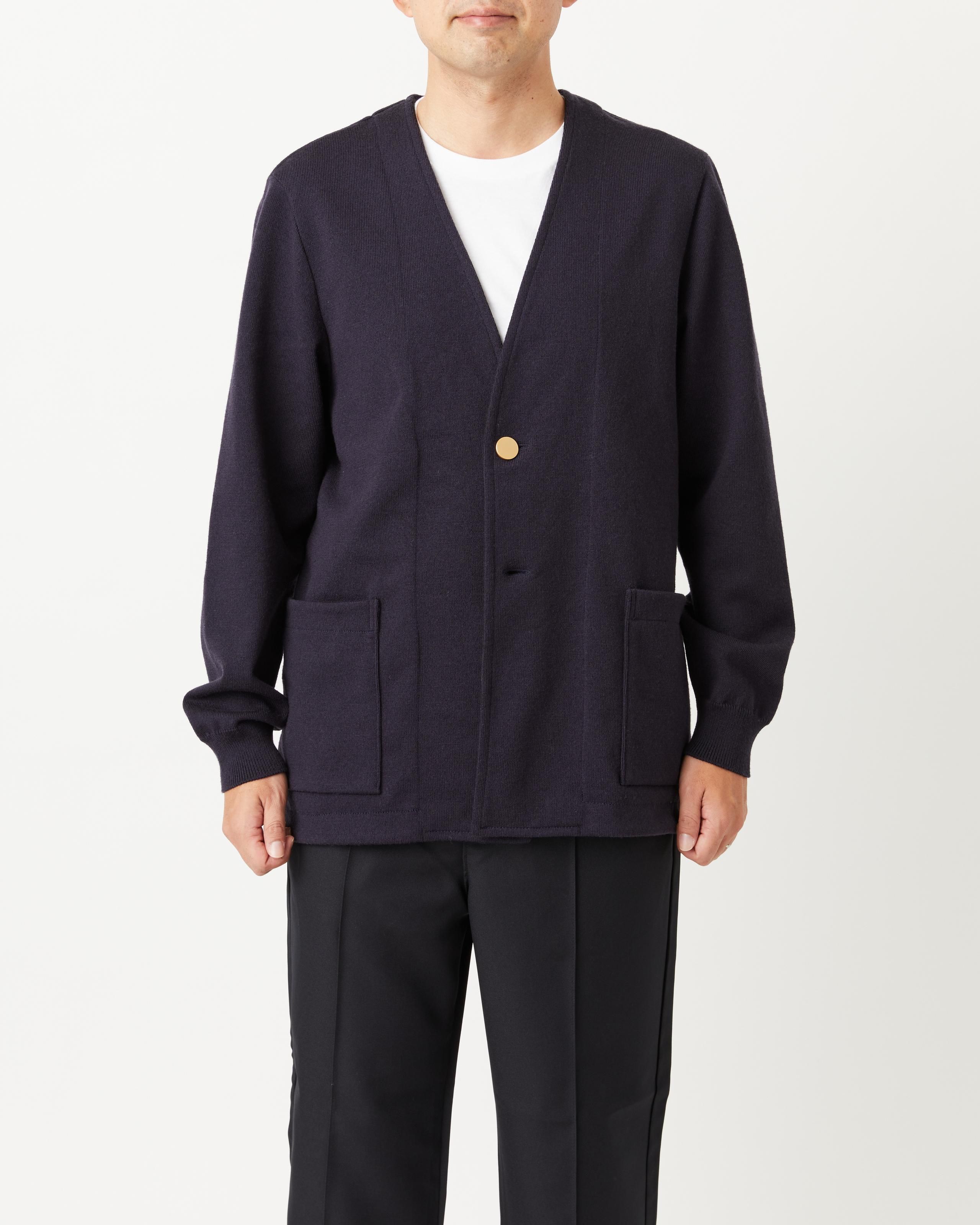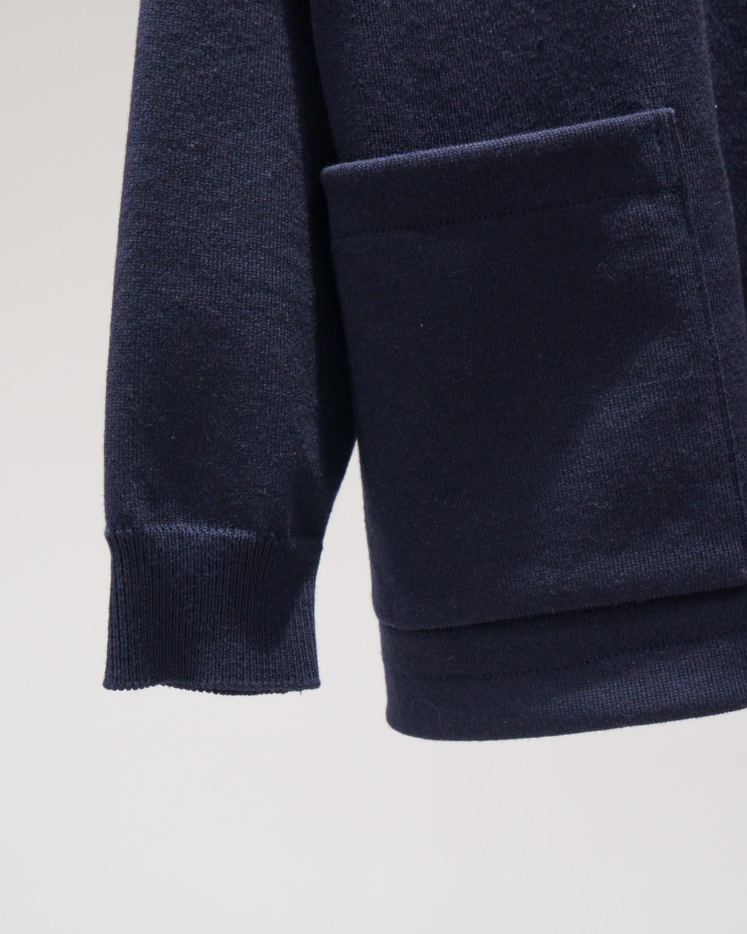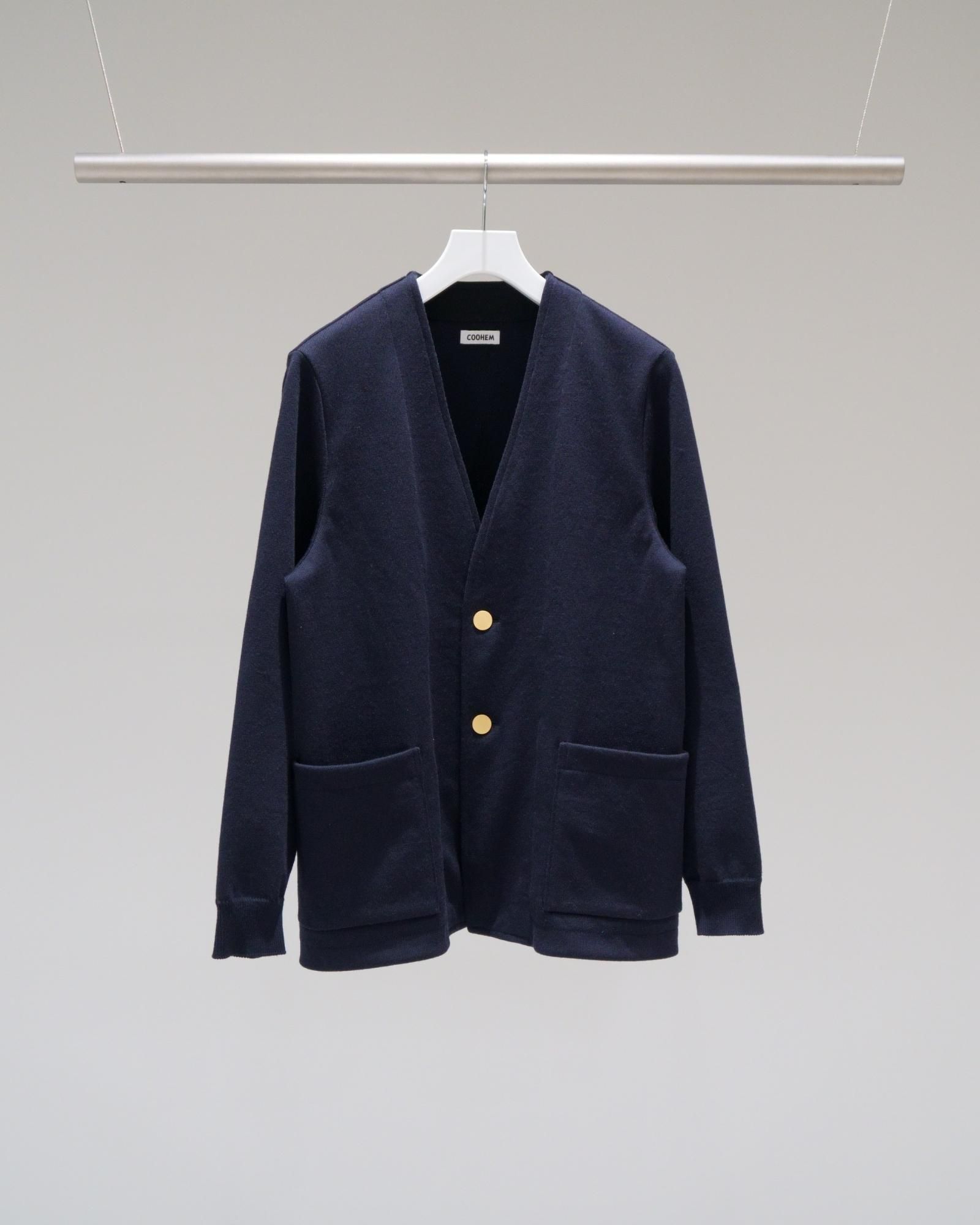 ウールの強撚糸を使用したカーディガンジャケット。 滑らかなウール糸とポリエステル糸を組み合わせ、軽さとハリ、ストレッチ性を出しています。ジャケットの上品さとカーディガンのリラックス感を併せ持つ一着です。