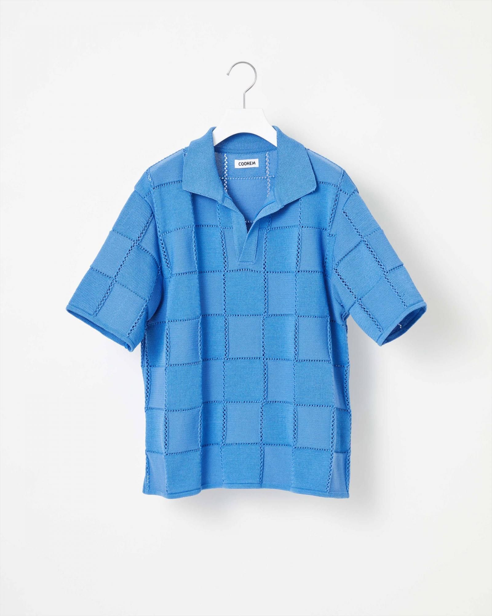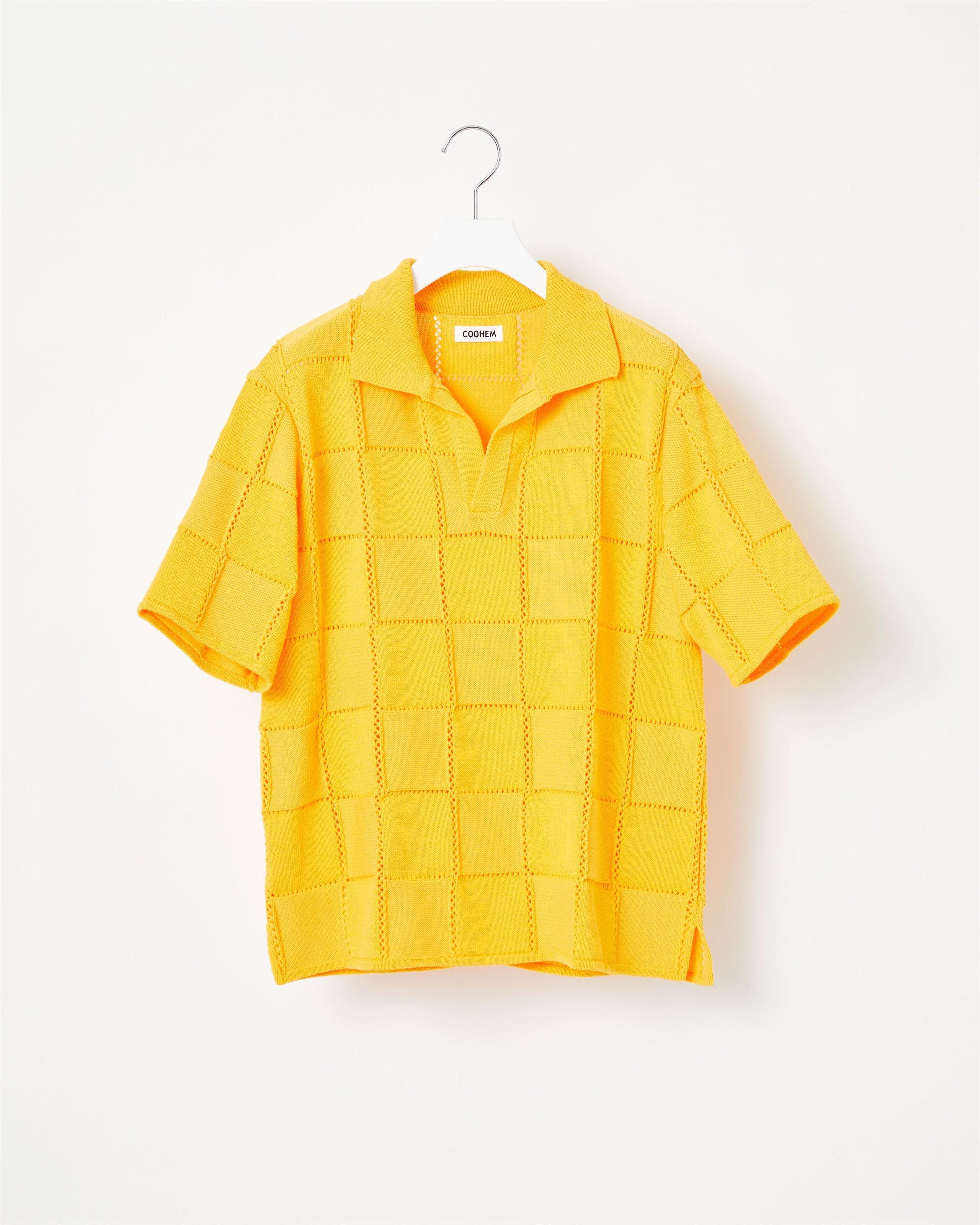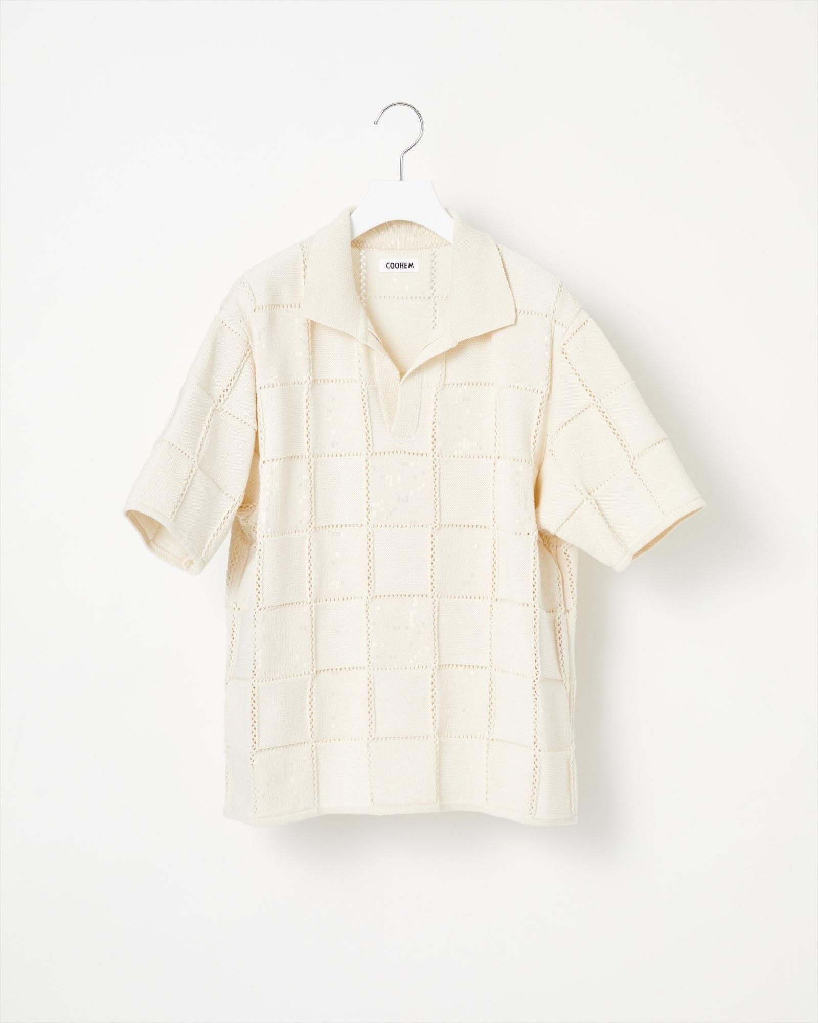 表目・裏目を交互に繰り返すリンクス編みと呼ばれる編み方を応用し、ブロックチェック柄で表現したサマーニット。編み組織の違いで絶妙な濃淡が現れています。 フロントはボタンなしのスキッパーシャツデザイン。軽く柔らかな風合いです。
