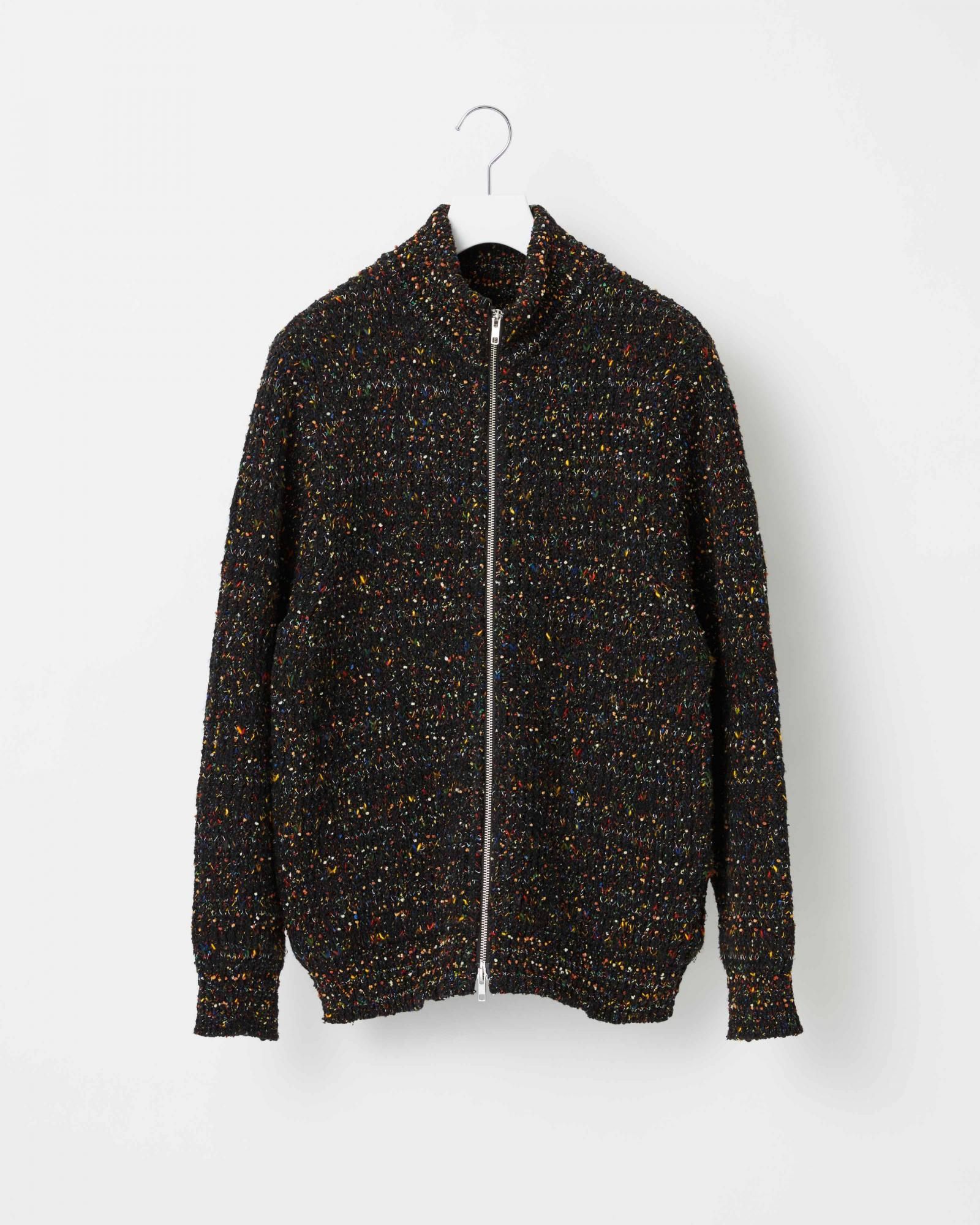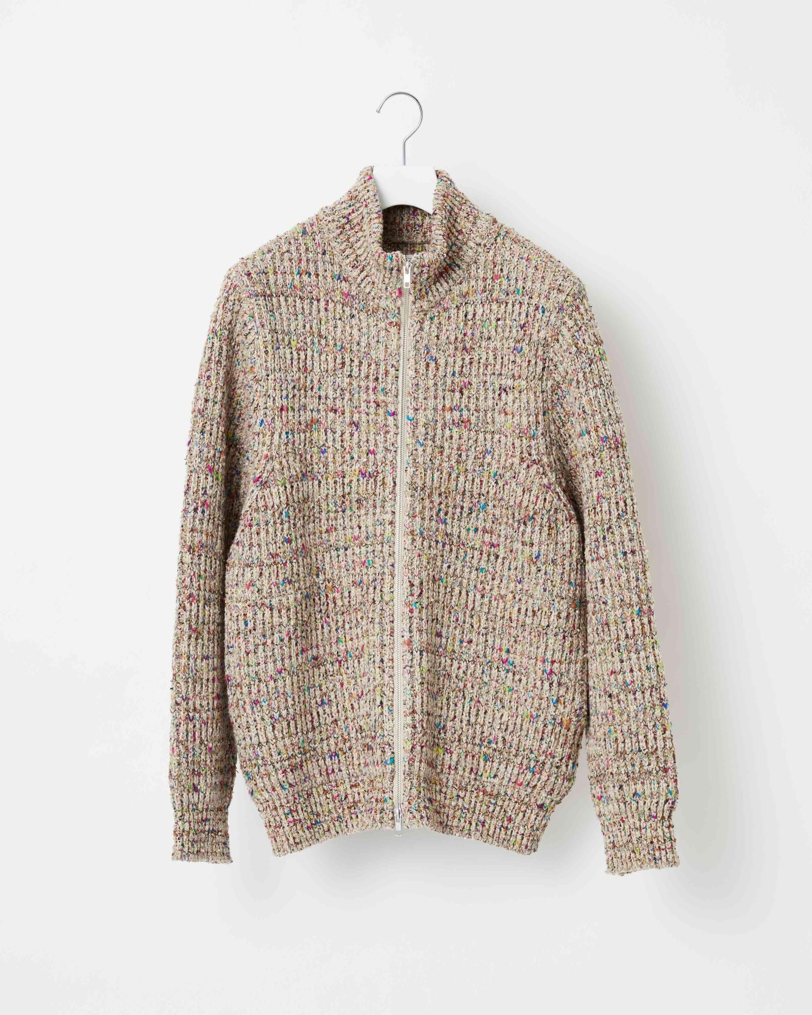 形状やカラーリングの異なるファンシーヤーンを組み合わせ、複雑なカラーネップを表現したリブニットブルゾン。 ベースとなる素材はコットンとウールを使用、毛羽立ちすぎず、秋口から春先まで着られる程よい暖かさです。
