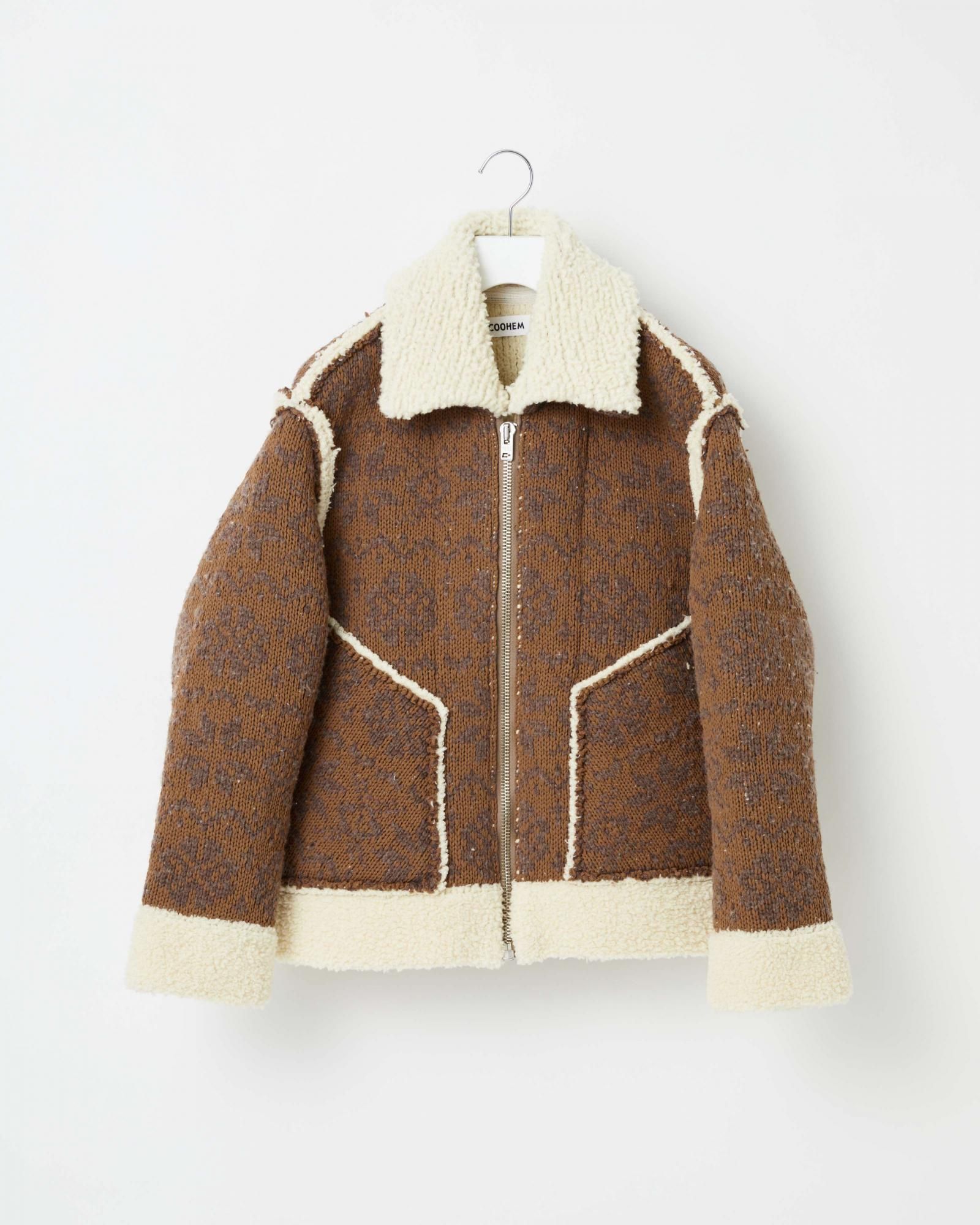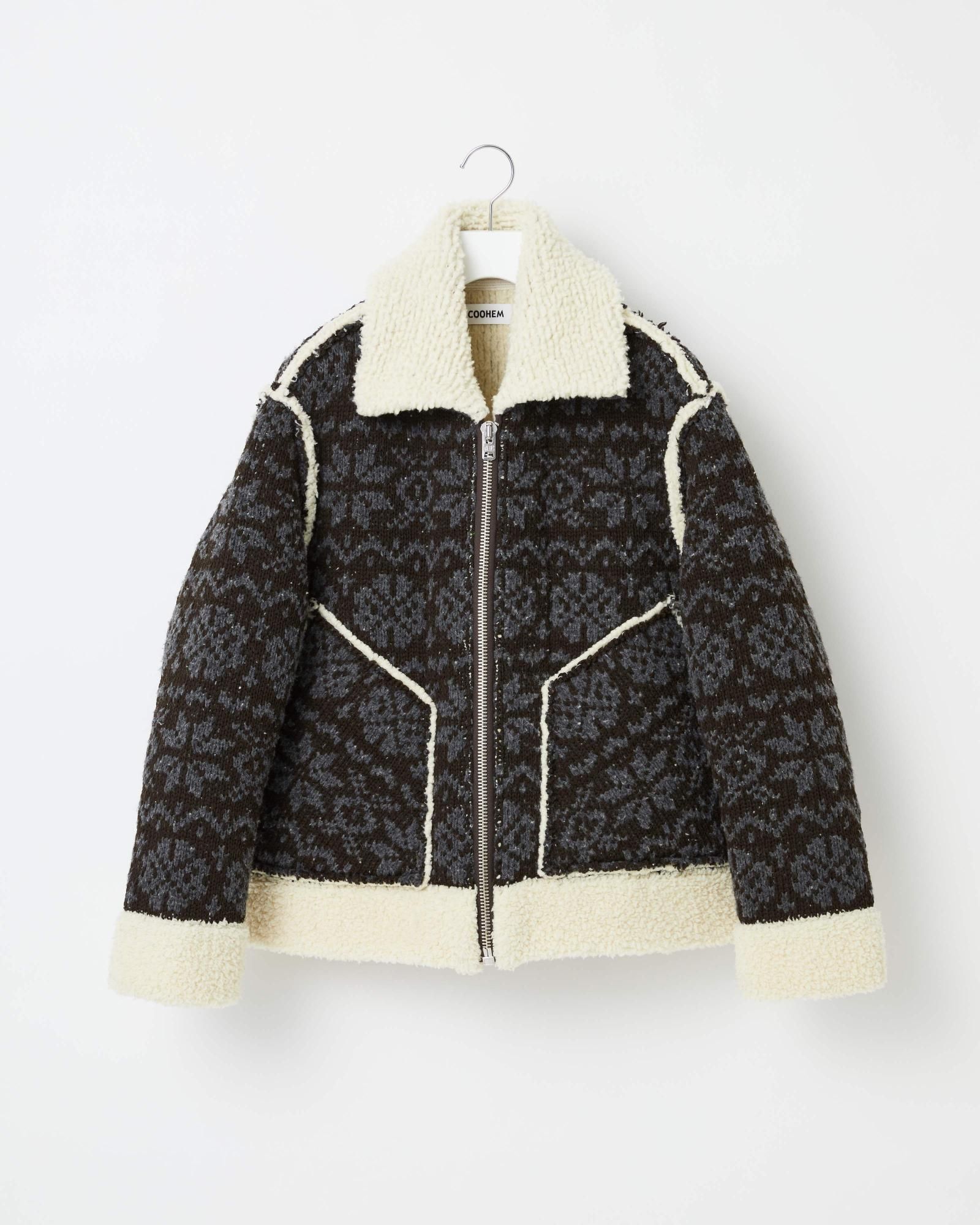 フェアアイルニットとムートンジャケットを融合、表側はジャガードバターン、内側は柔らかなタッチのウールモールの2重構造です。リアルムートンのような暖かさと、リアルにはない軽やかな着心地が特徴です。