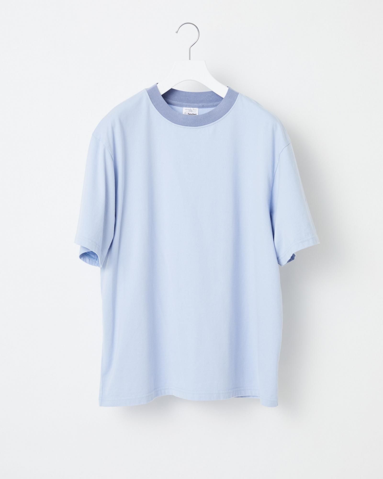 インナーとしてのTシャツは少し透ける、ヘビーウエイトだと厚みがあってインナーとの兼用ができない。目指したのは、そうした悩みを解決した「ちょうどいい」1枚。 ジャージー生地のボディにニットの衿をドッキングし、衿が伸びにくい仕様に仕立てました。 リンガーTシャツを着想源に、トーンオントーンによる大人が着やすい配色が特徴です。