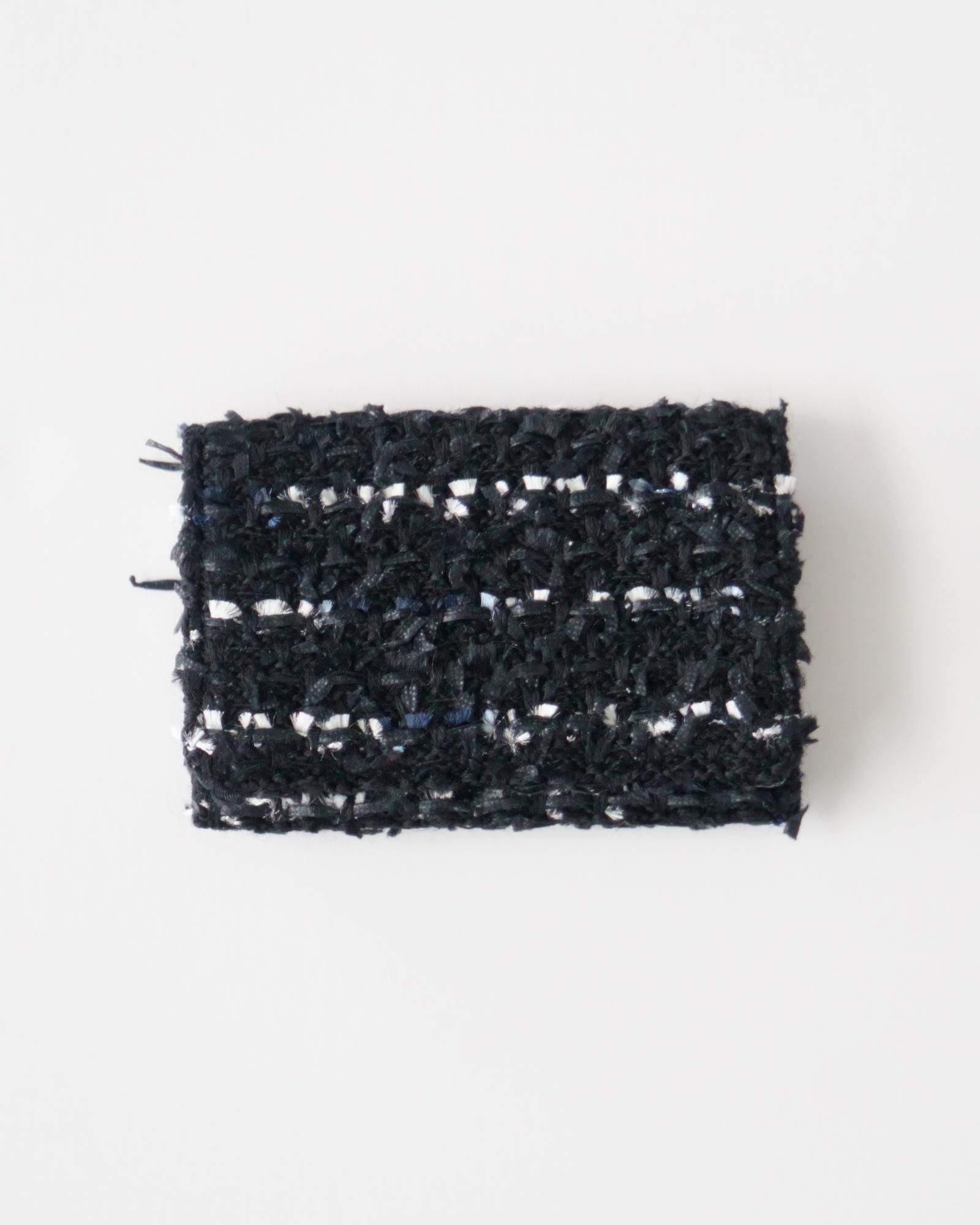 ツウィードのライダースジャケットに使用されたテキスタイル。シックな雰囲気と華やかさを併せ持つ大人のニットツウィードです。