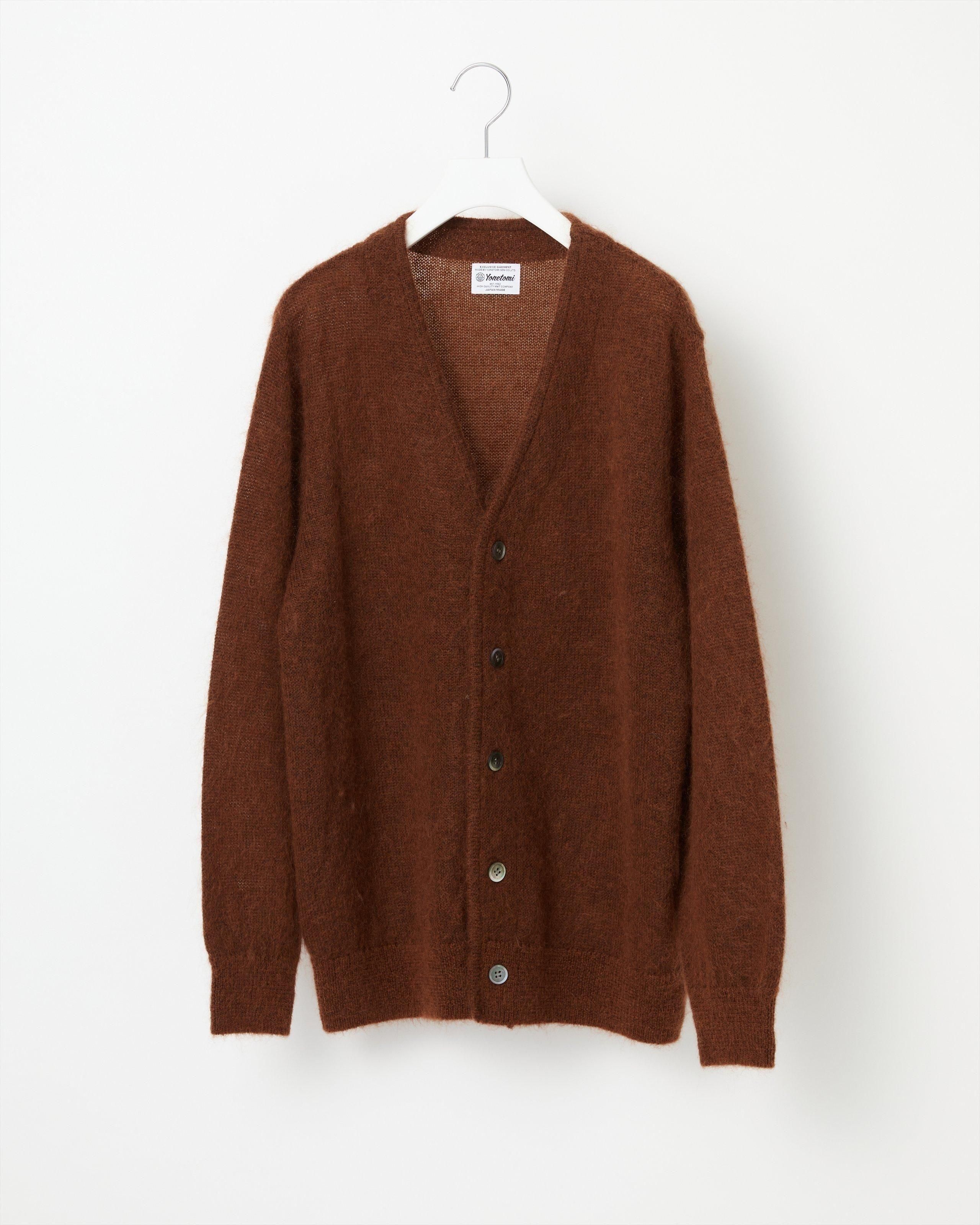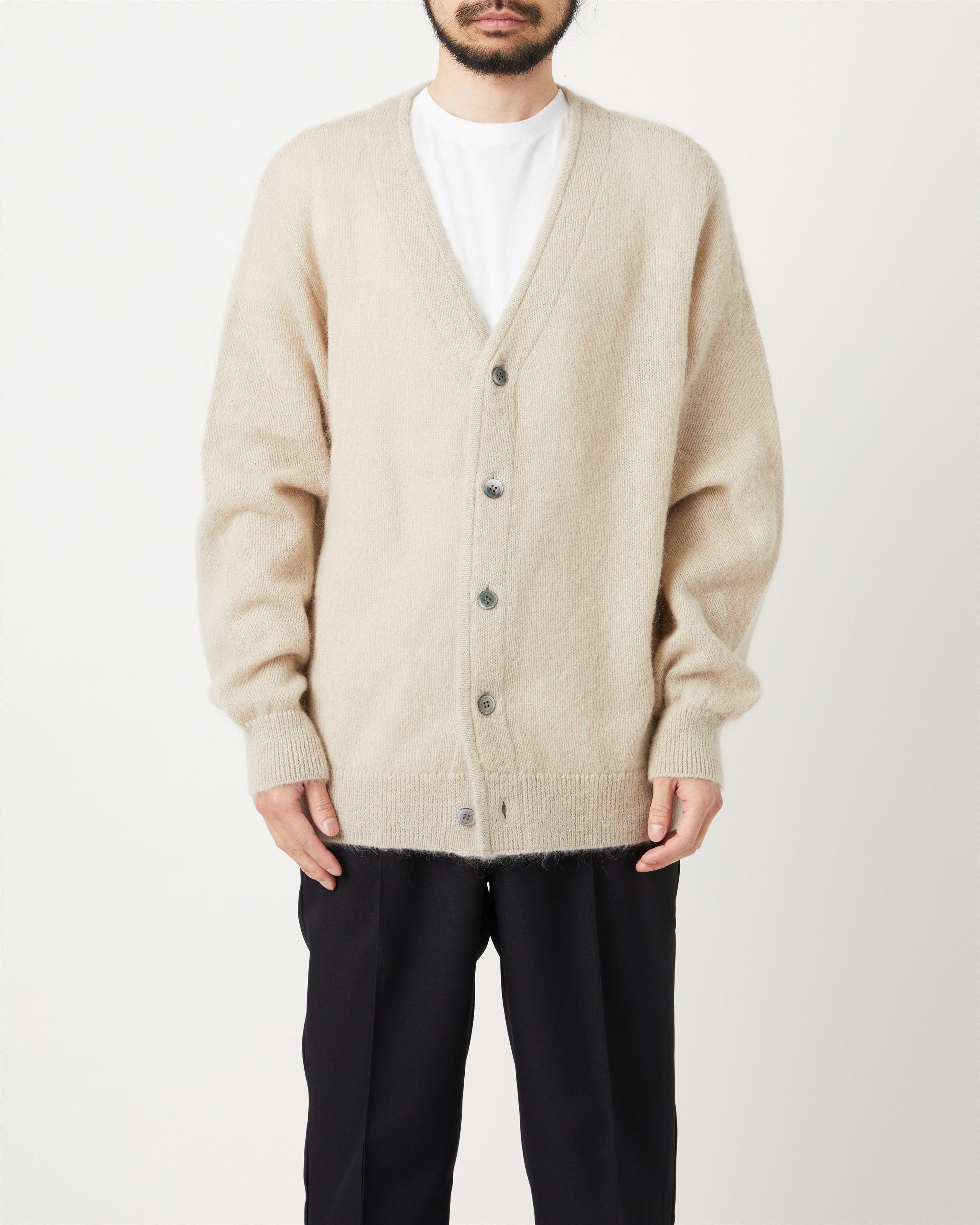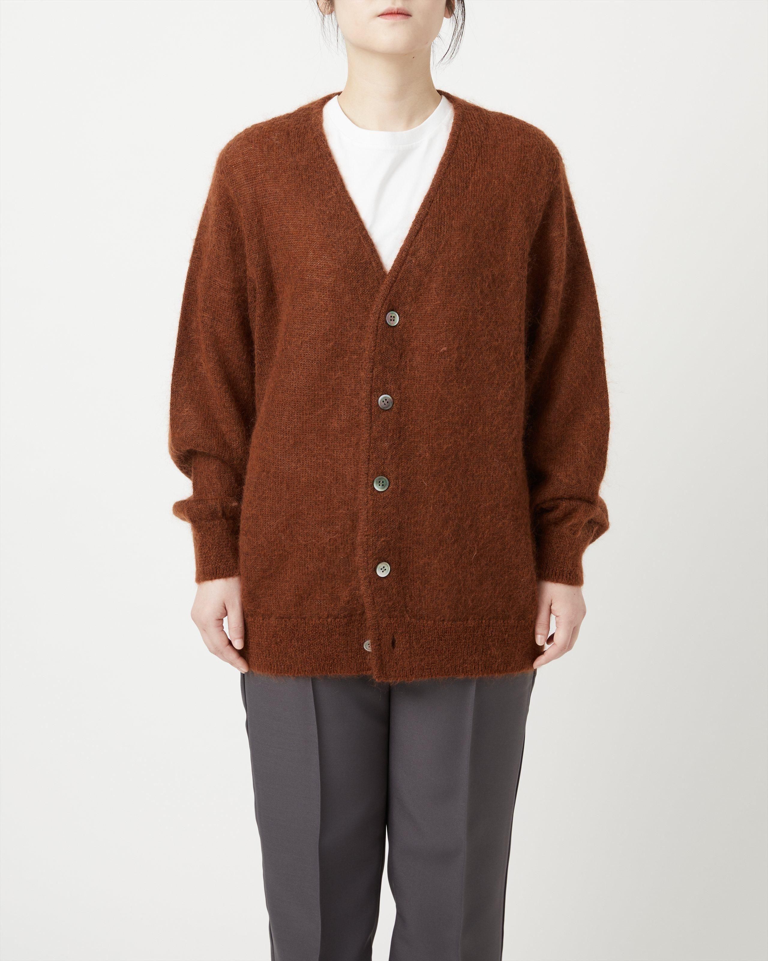 キッドモヘヤ糸を使用したニットカーディガン。 モヘヤ特有の毛足と軽さ、空気を多く含むことによる暖かな着心地が特徴。特殊な加工方法によりチクチクしにくく、柔らかな風合い。ヴィンテージライクな雰囲気が特徴です。