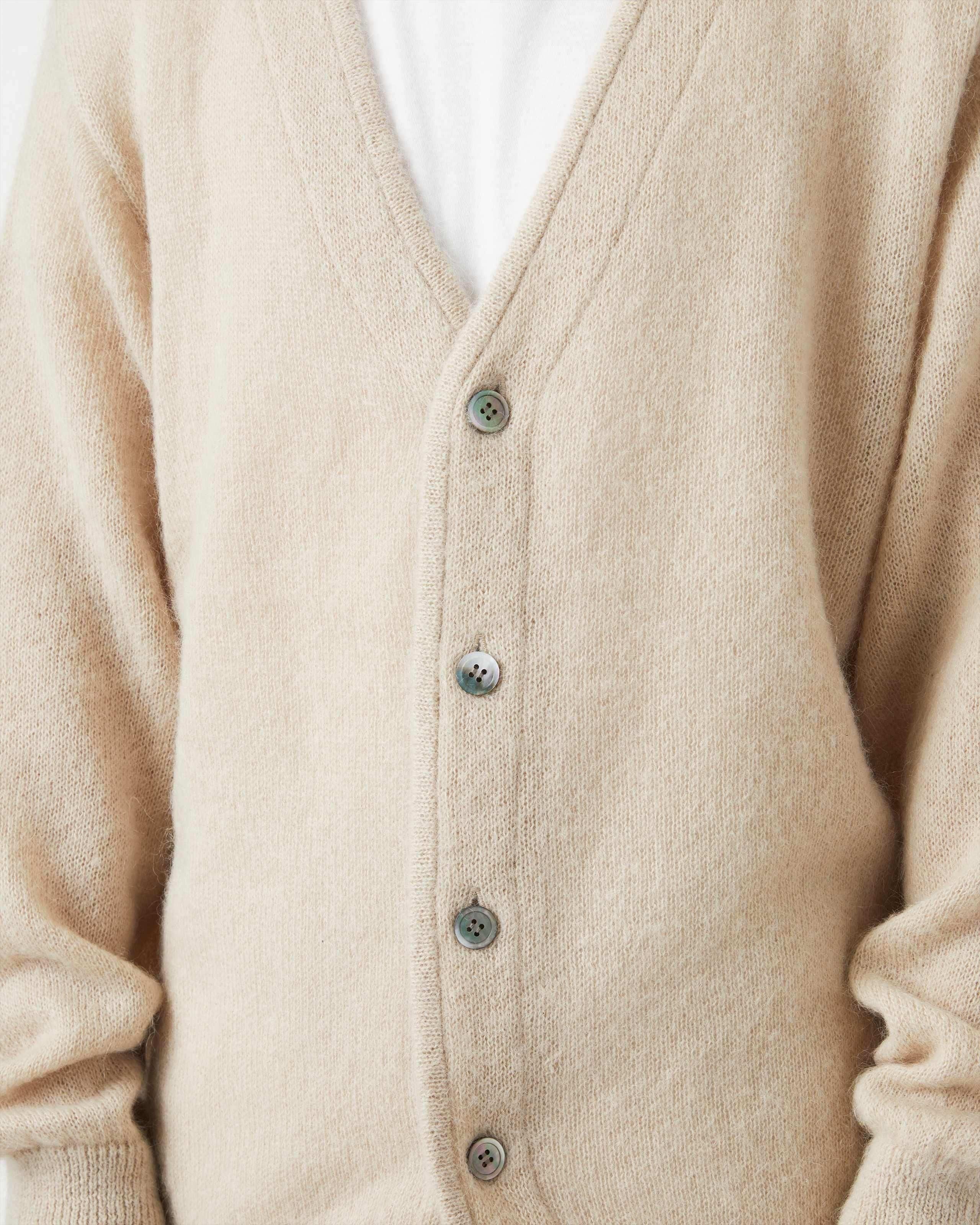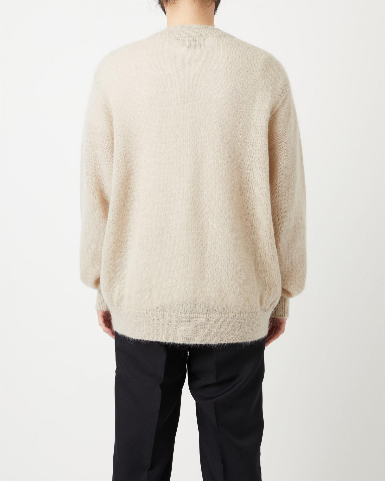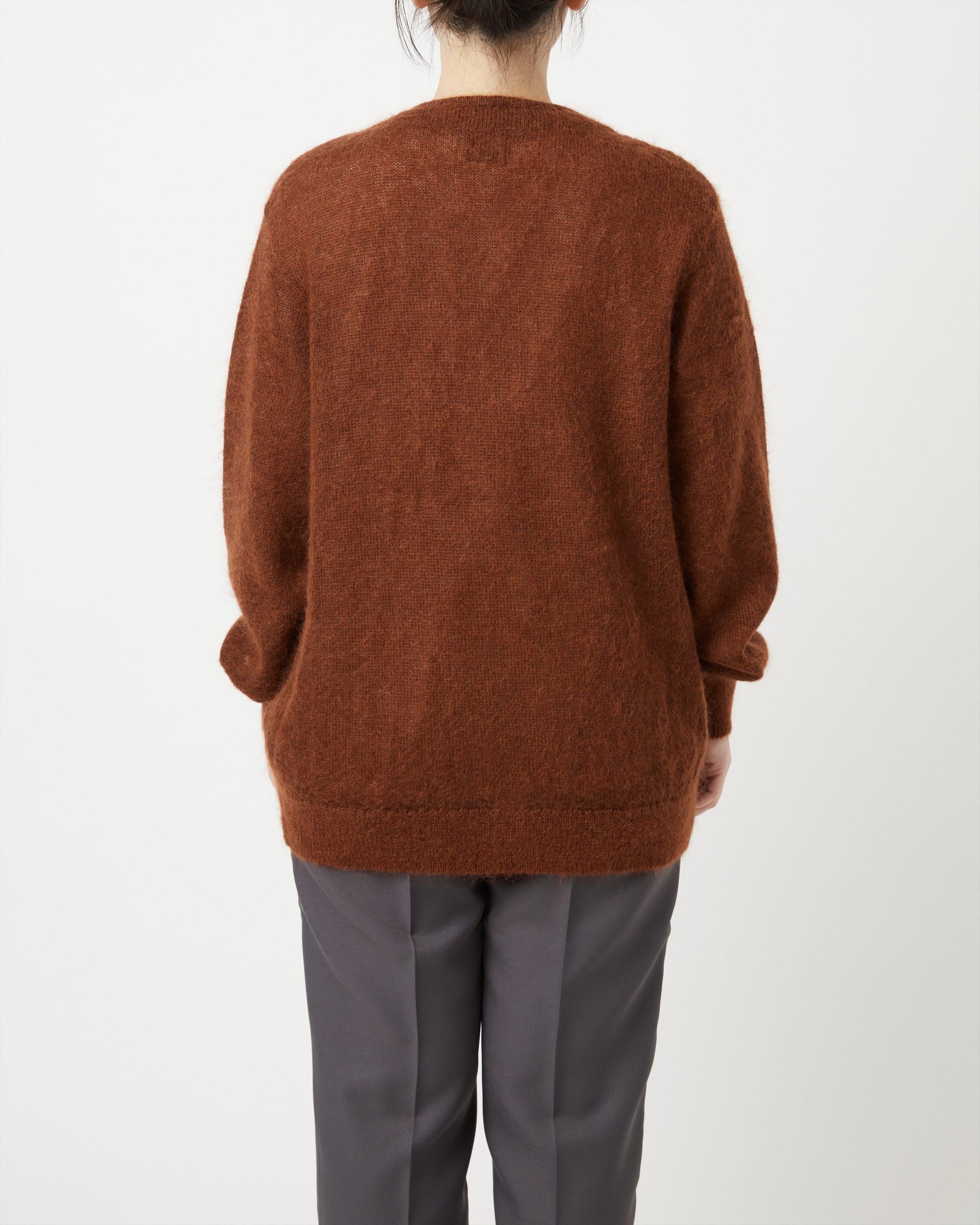 キッドモヘヤ糸を使用したニットカーディガン。 モヘヤ特有の毛足と軽さ、空気を多く含むことによる暖かな着心地が特徴。特殊な加工方法によりチクチクしにくく、柔らかな風合い。ヴィンテージライクな雰囲気が特徴です。