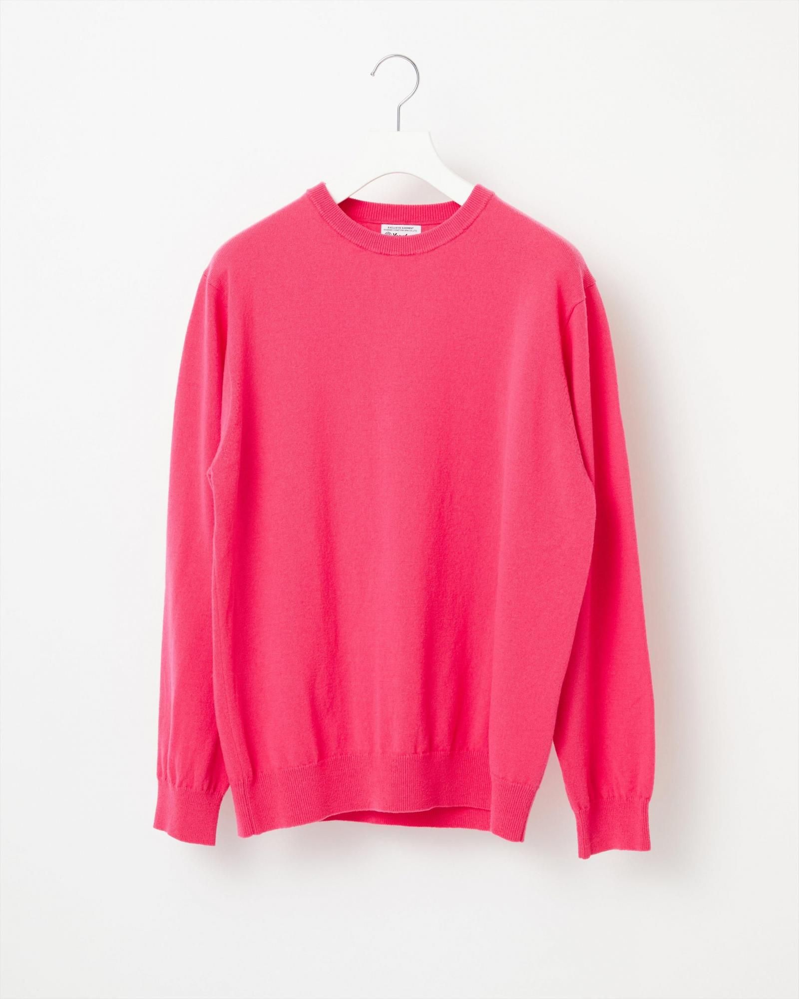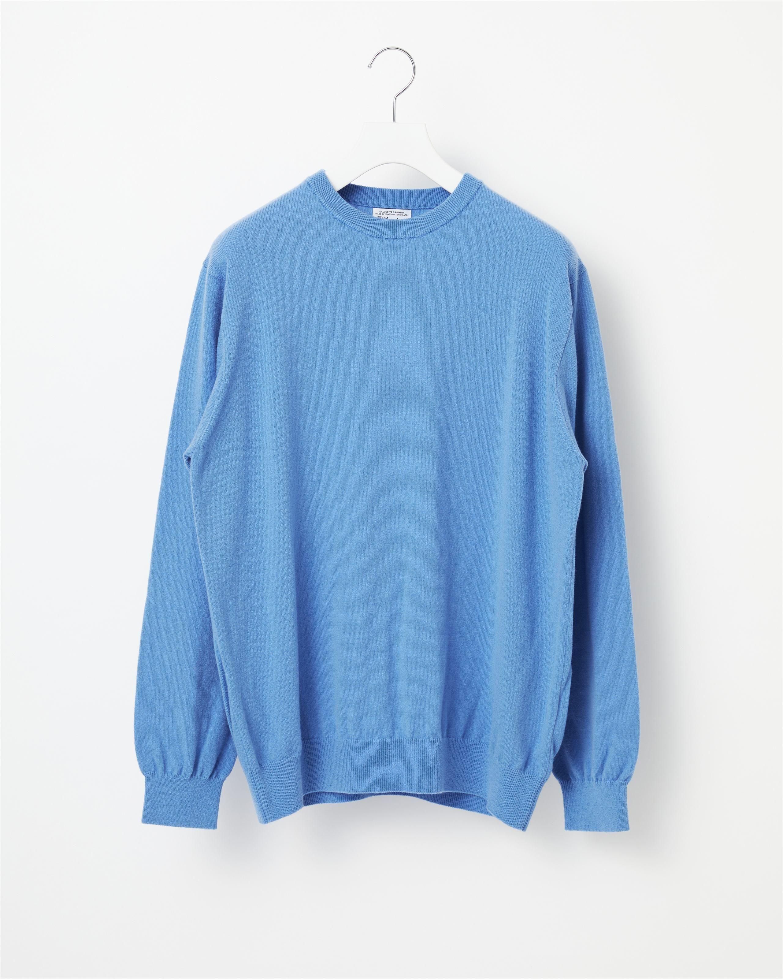 2種のウールとカシミヤのオリジナル配合により、素材のいいとこ取りをしたこだわりの紡毛糸を使用。軽く、柔らかく、薄手ながらも密度と膨らみを持ち、かつホームクリーニングにも対応。普段使いに最適なアイテムです。