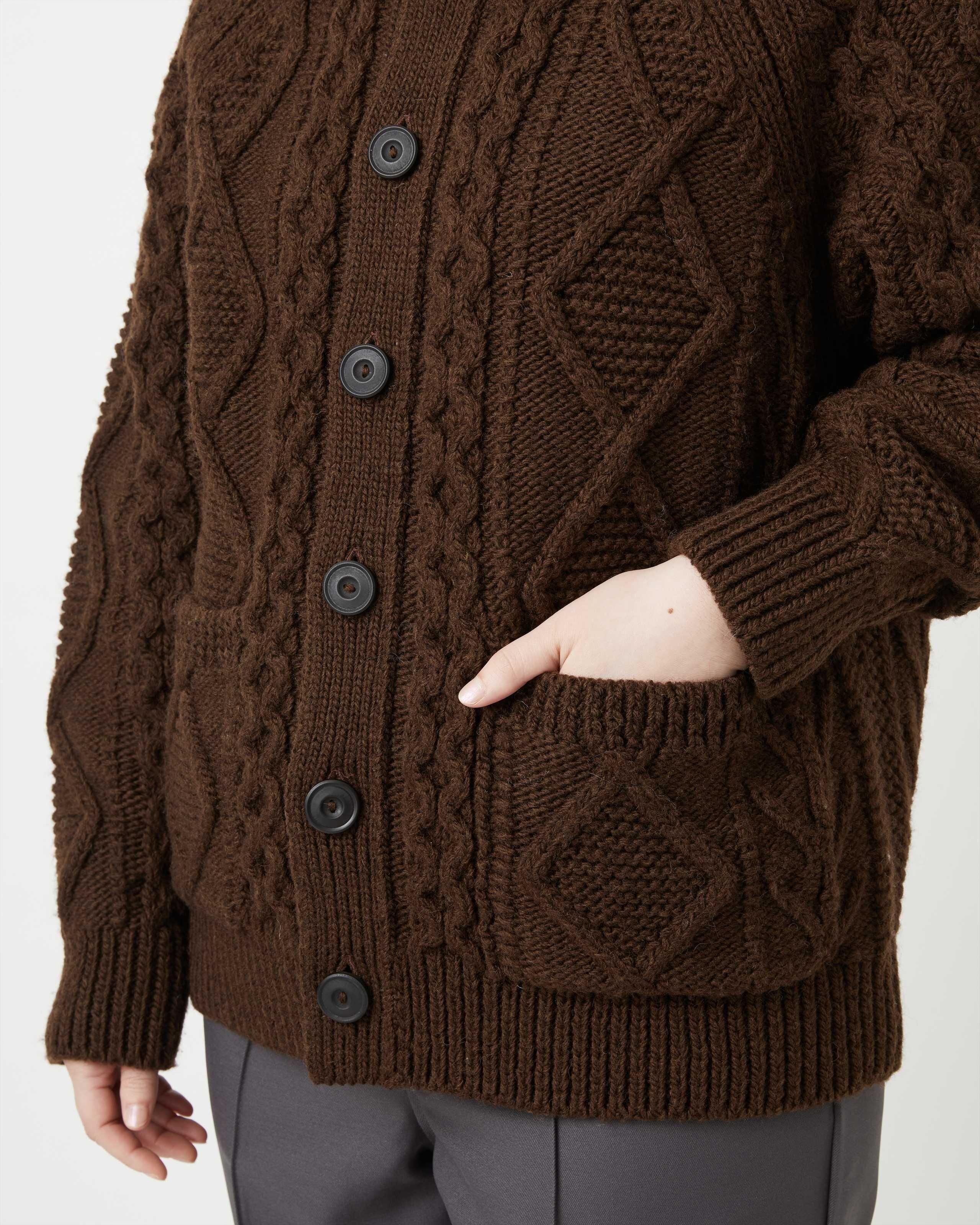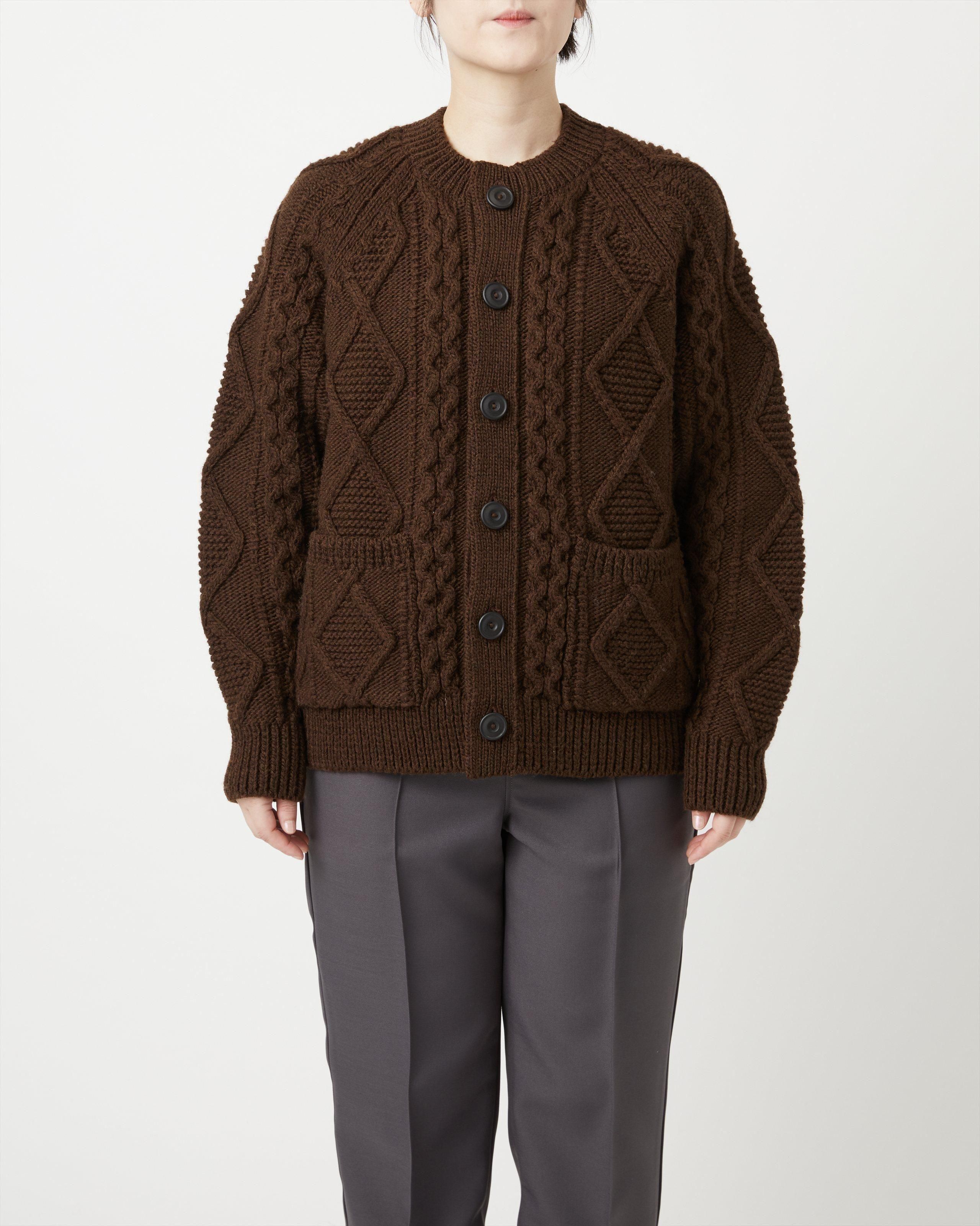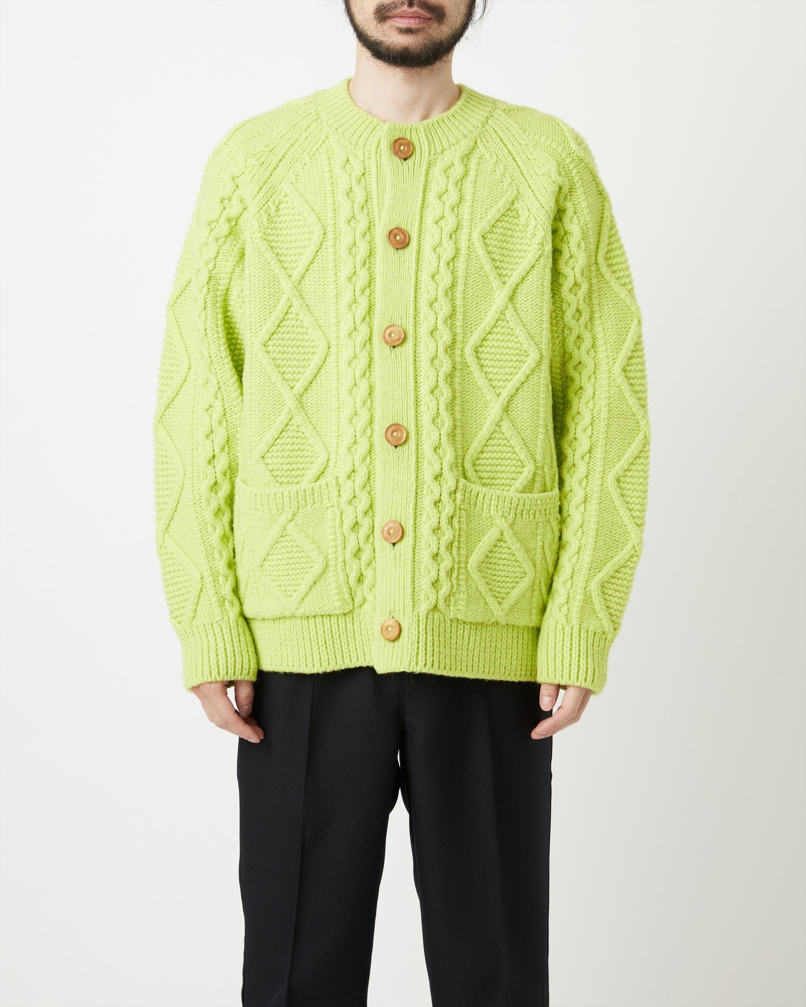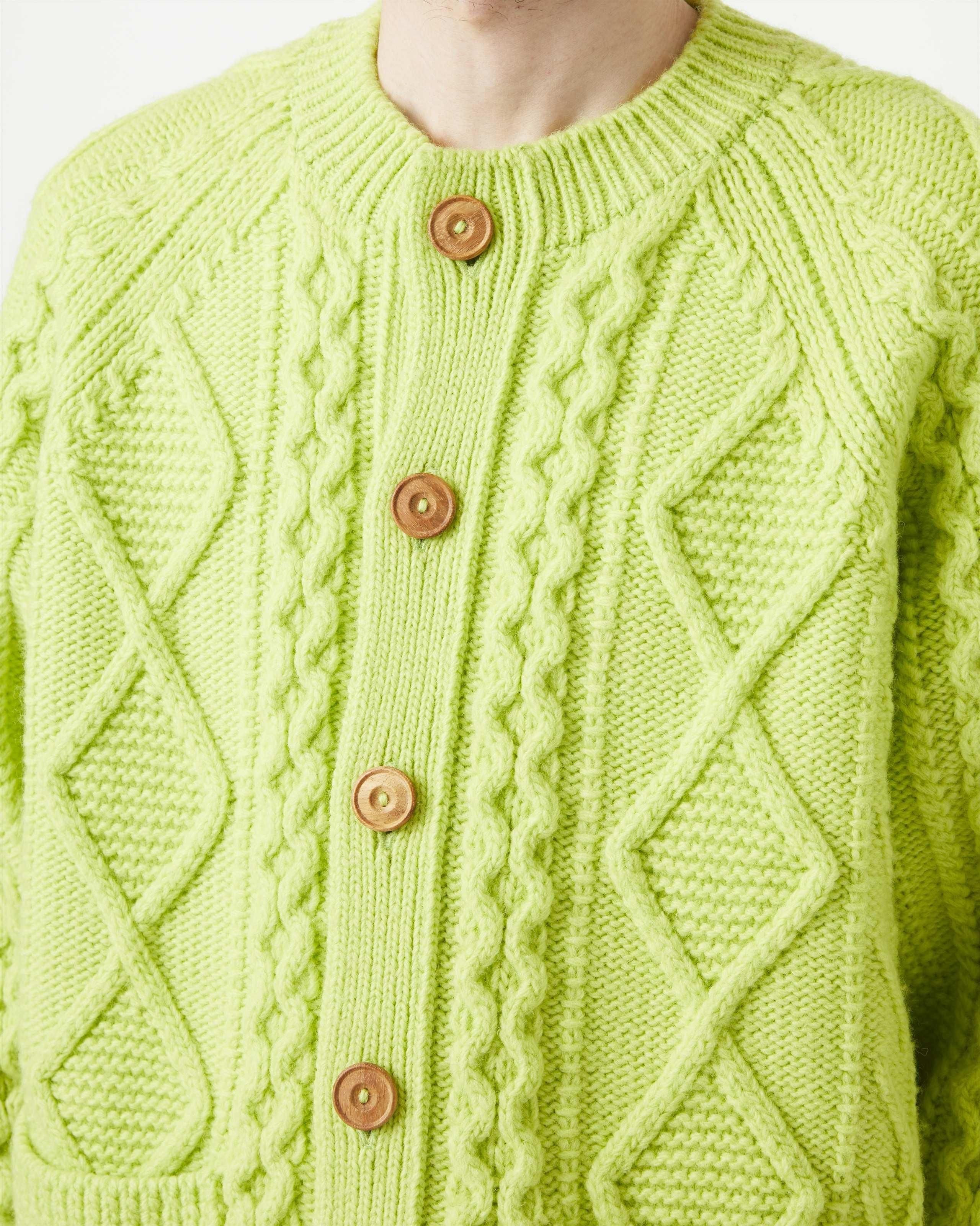 オーセンティックなアランセーターを機械編みで表現。素材は膨らみに富んだ甘撚りの極太ウールを使用、アランセーターらしいややカサッとした風合いがありつつ、普段使いし易い柔らかさと軽さ、またありそうでないフレッシュなカラーリングが特徴です。