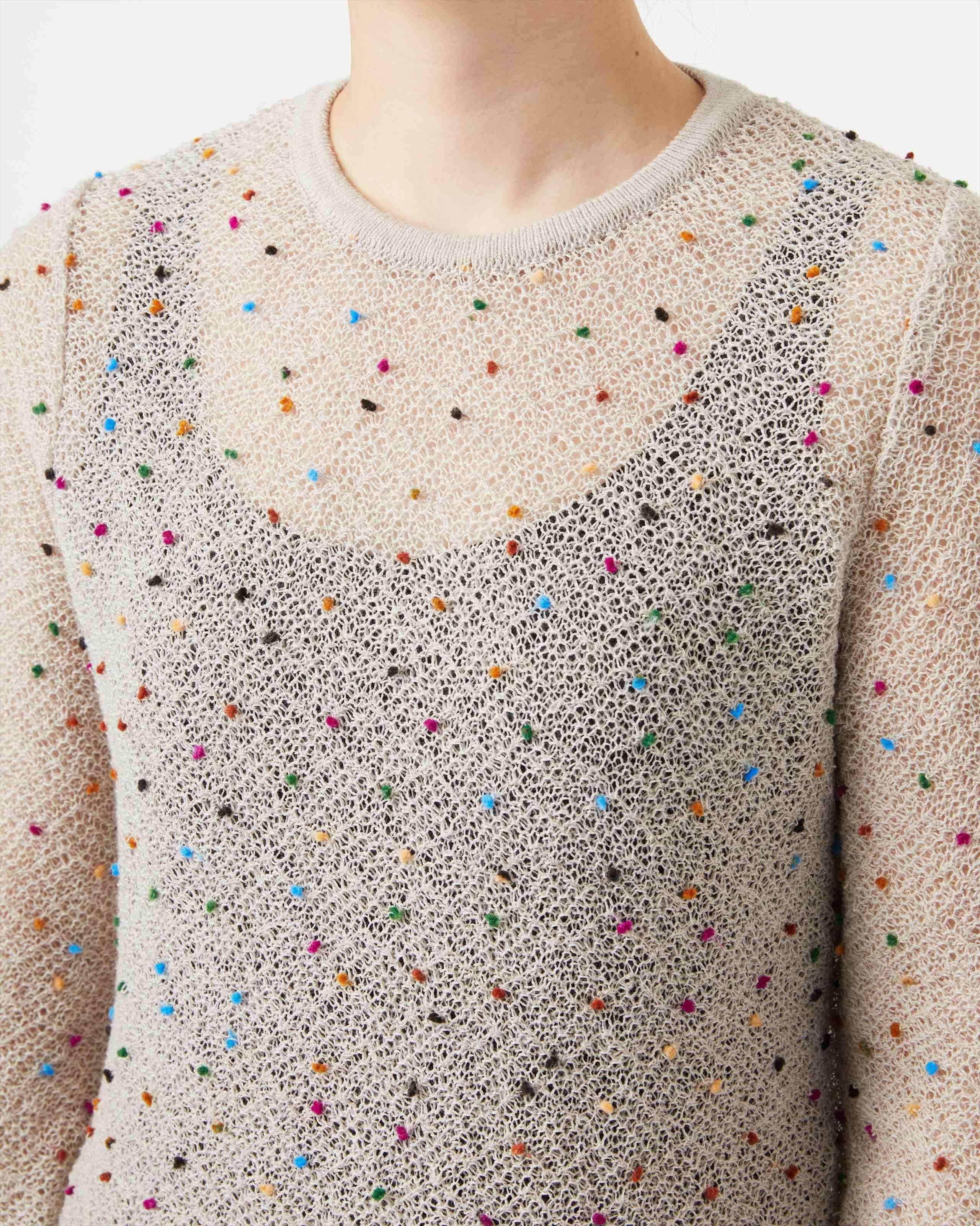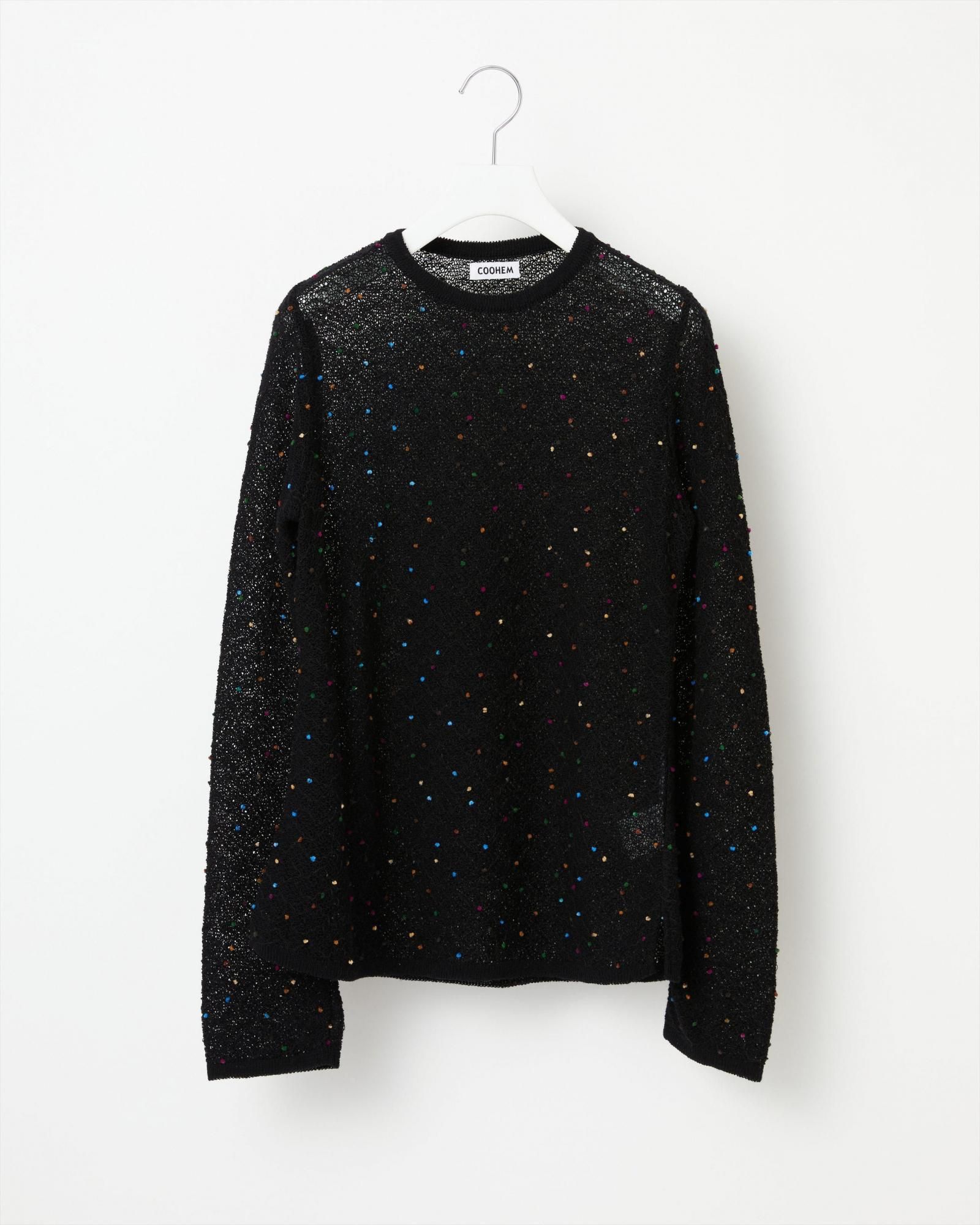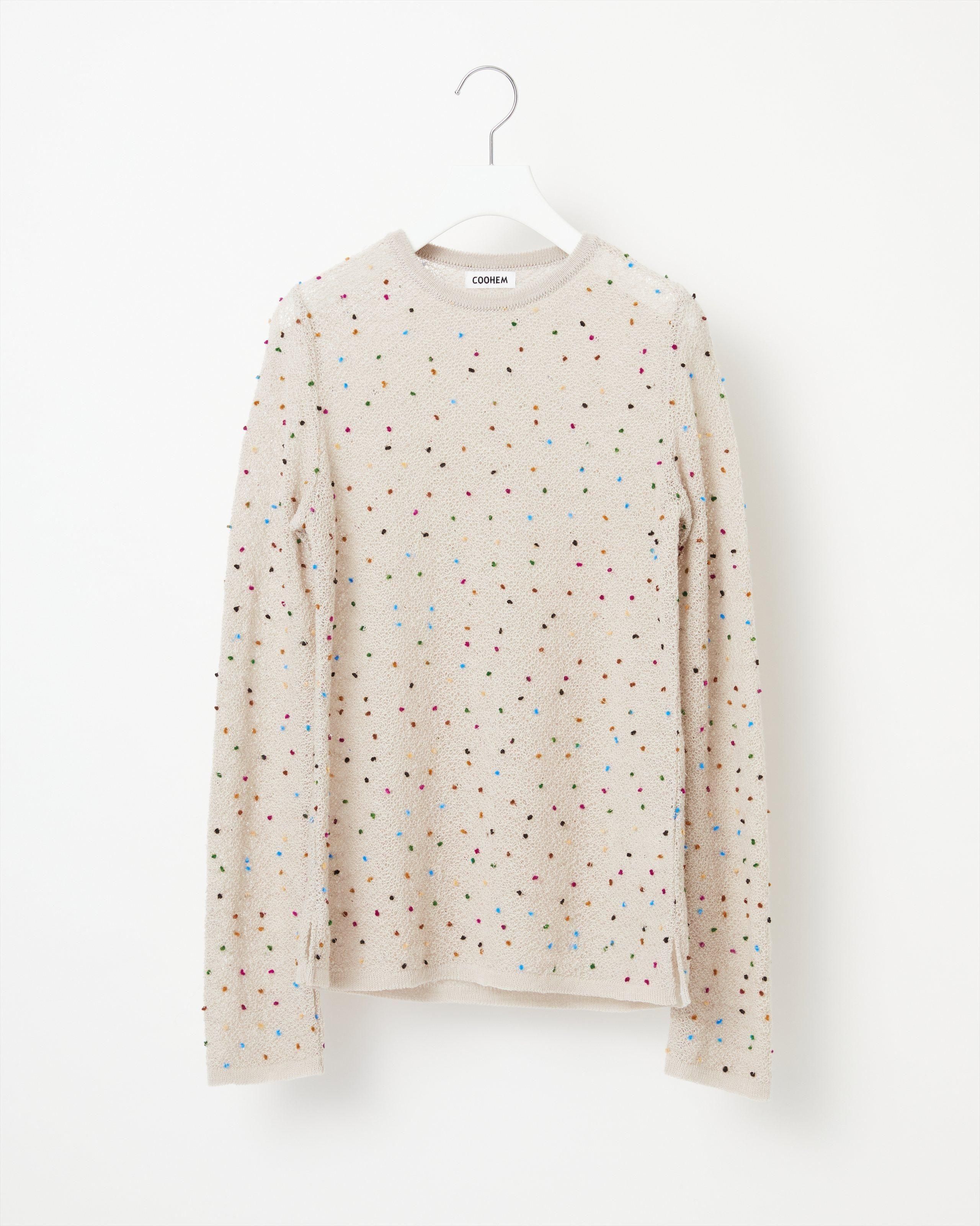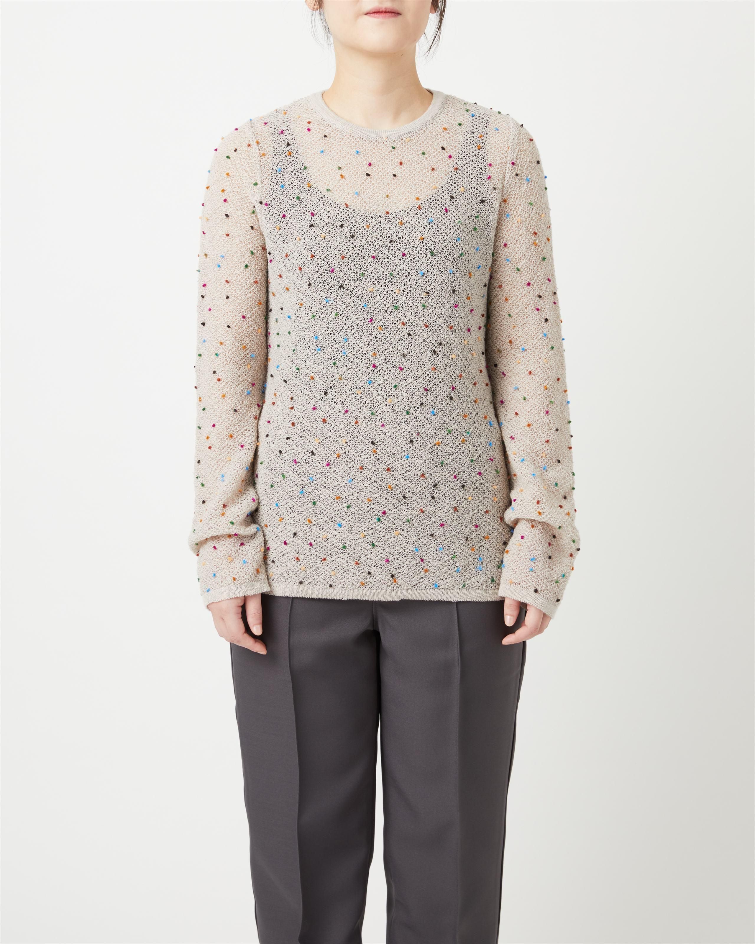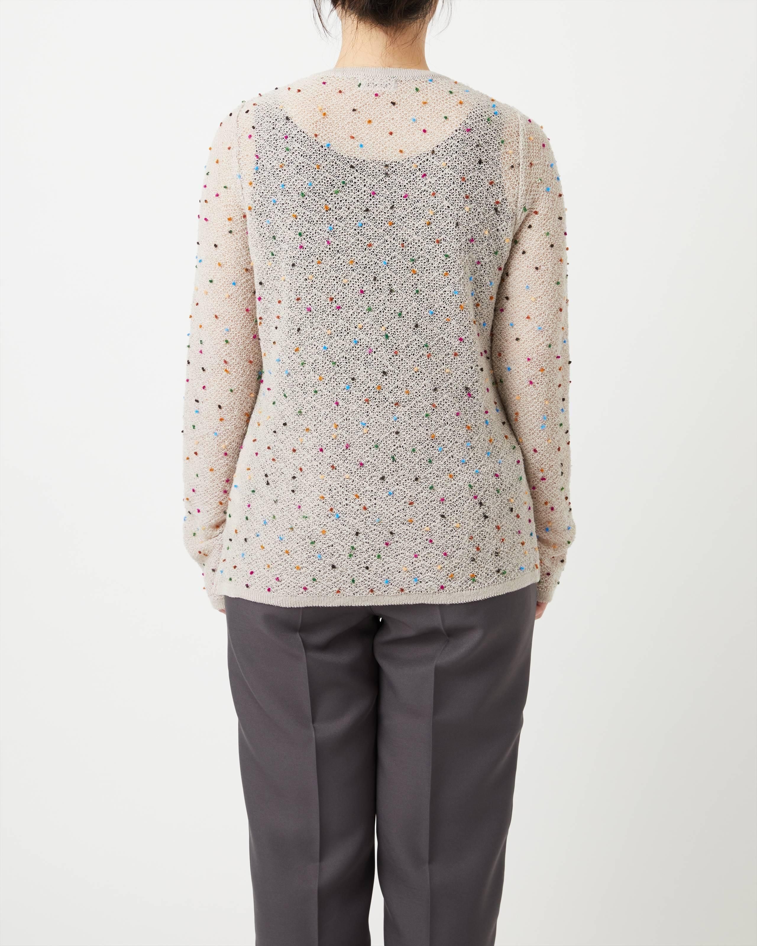 毛羽の少ないウール糸をベースに、マルチカラーのファンシーヤーン(意匠糸)を編み込んだニットトップ。 柔らかな風合いと透け感が特徴。伸縮性に富み、インナーを変えることで晩夏から春まで楽しめるアイテムです。