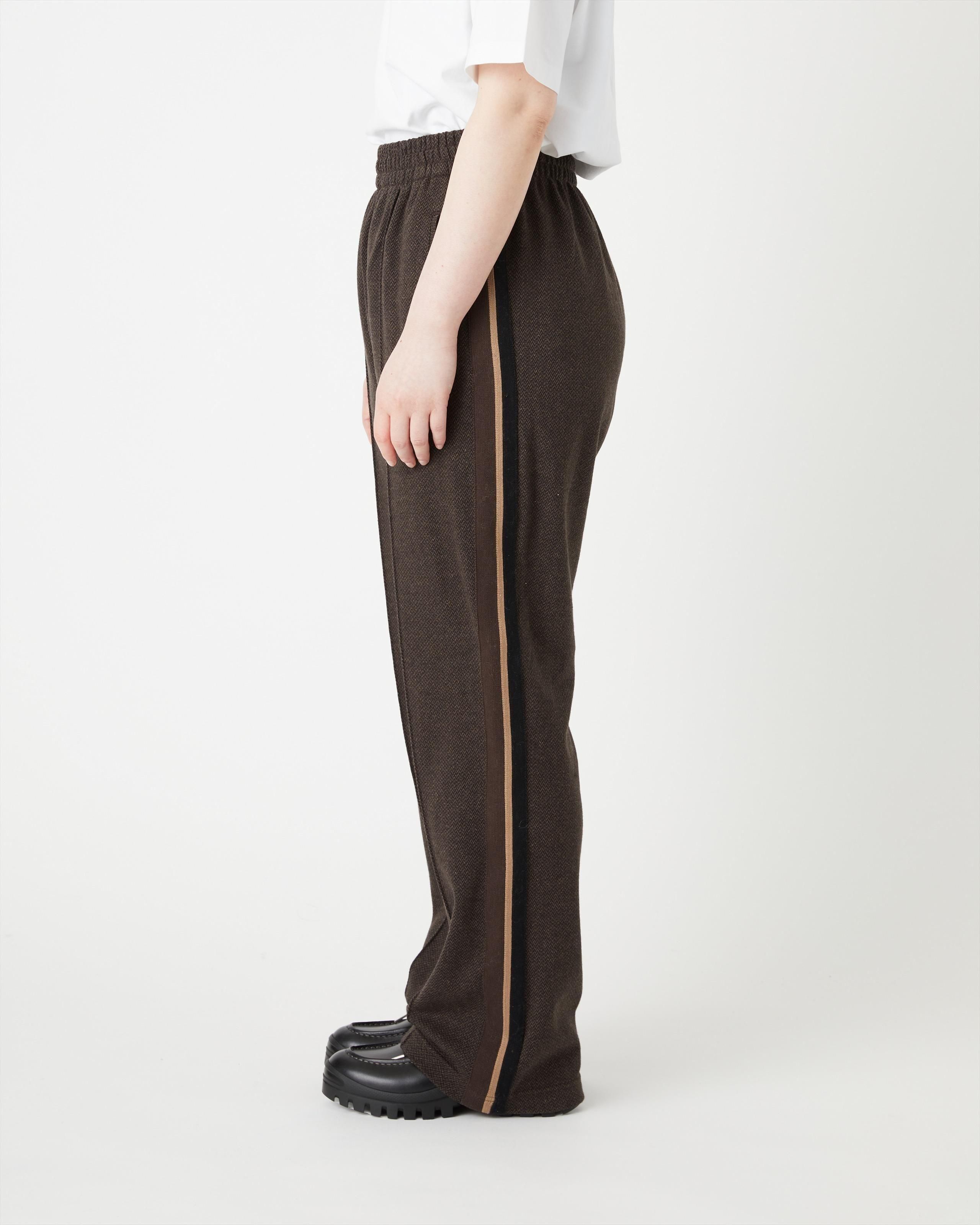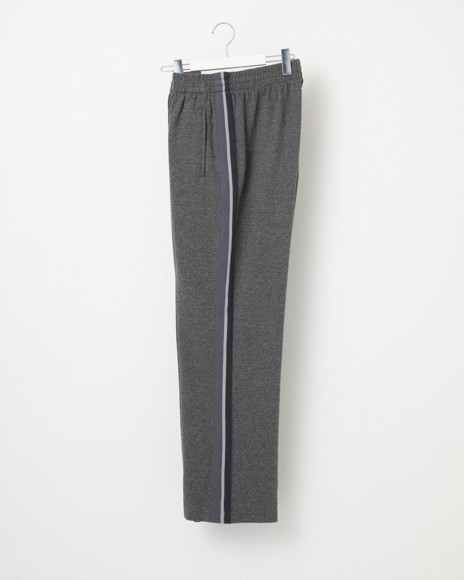 クラシックなスーツ地を思わせるヘリンボーン柄ジャージーを使用。 程よい光沢感と落ち感があり、スラックスの様な雰囲気を持つトラックパンツです。オリジナルのニットパーツによるサイドラインが特徴。