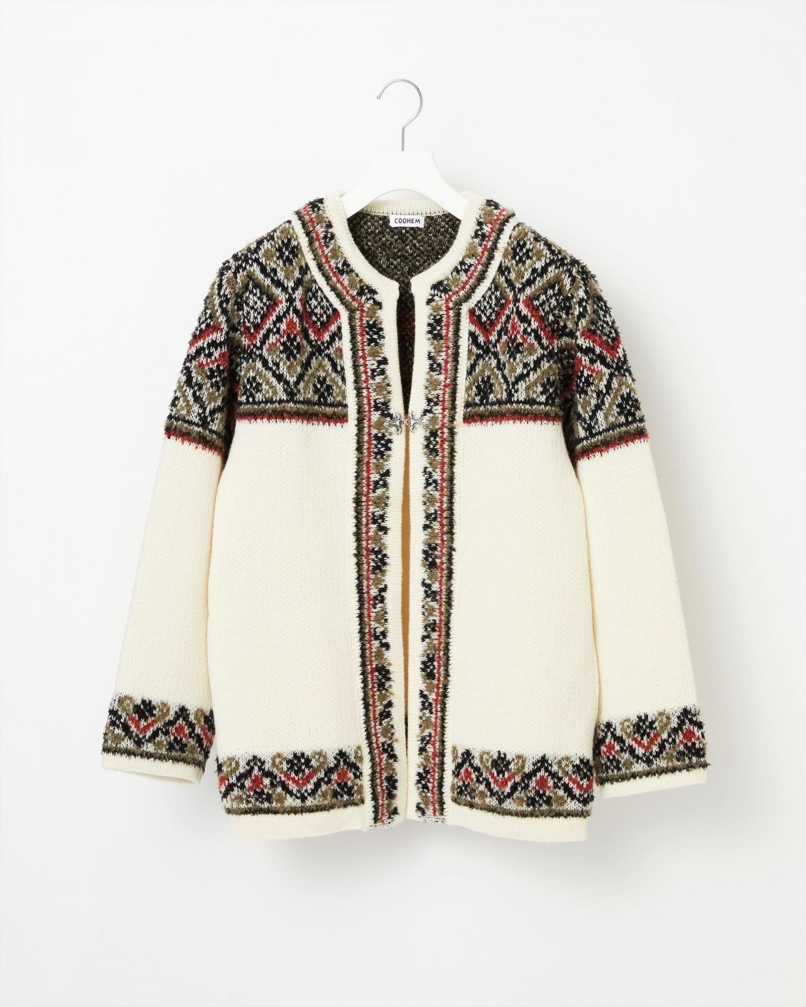 北欧の伝統的なニットカーディガンをブランドらしいユニークな糸使いで表現した、ライトアウターウエア。 ジャガード編みによる適度な厚みとハリ、ソフトな風合いと伸縮性が特徴です。