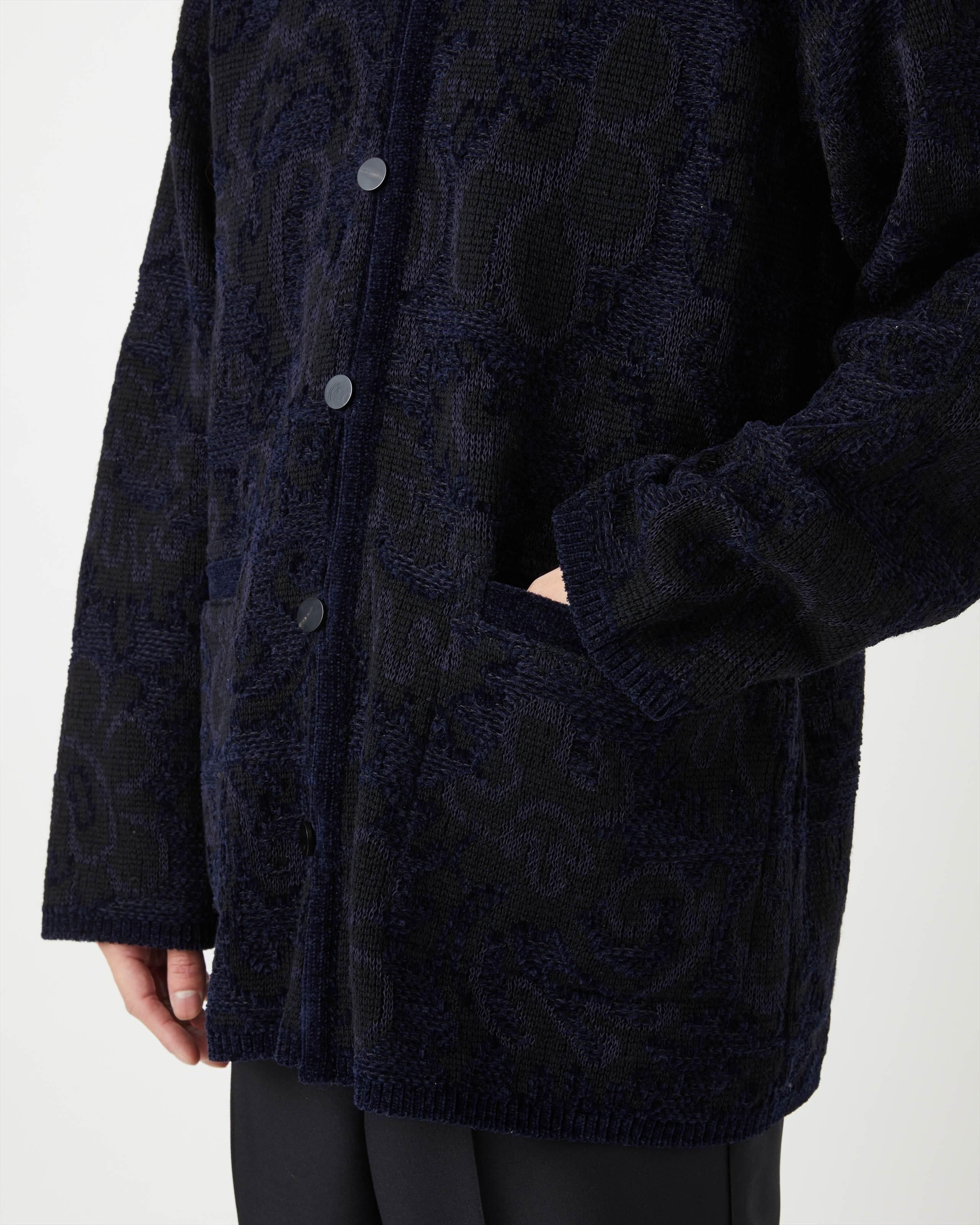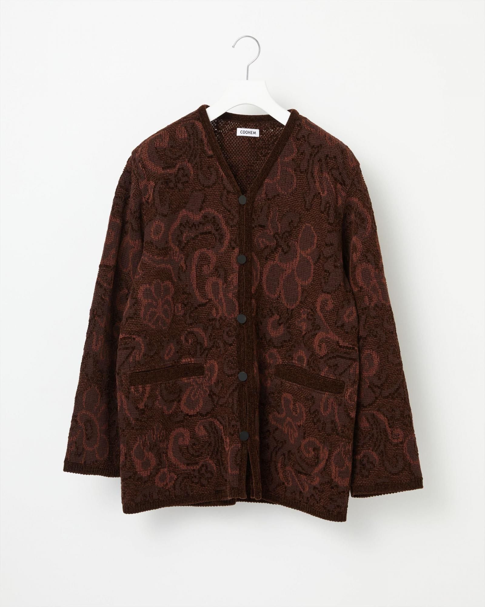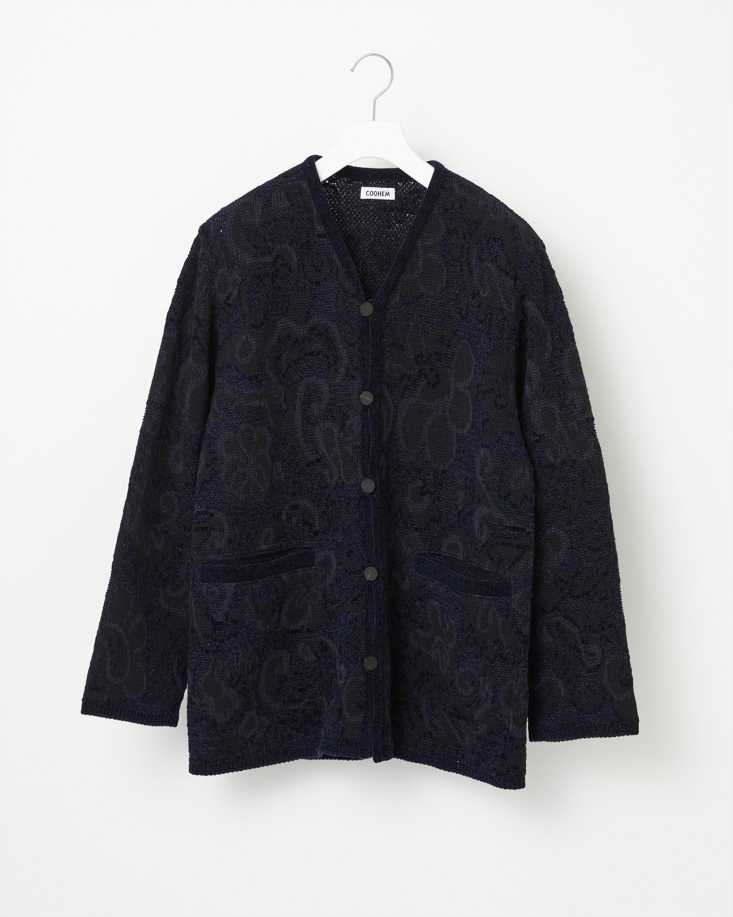 ゴブラン織をモチーフに、ベルベットタッチの意匠糸を使いジャガードテキスタイルで表現した軽量アウター。 驚くほどの軽さと柔らかな着心地、民藝的なムードを持つループボタンデザインが特徴です。