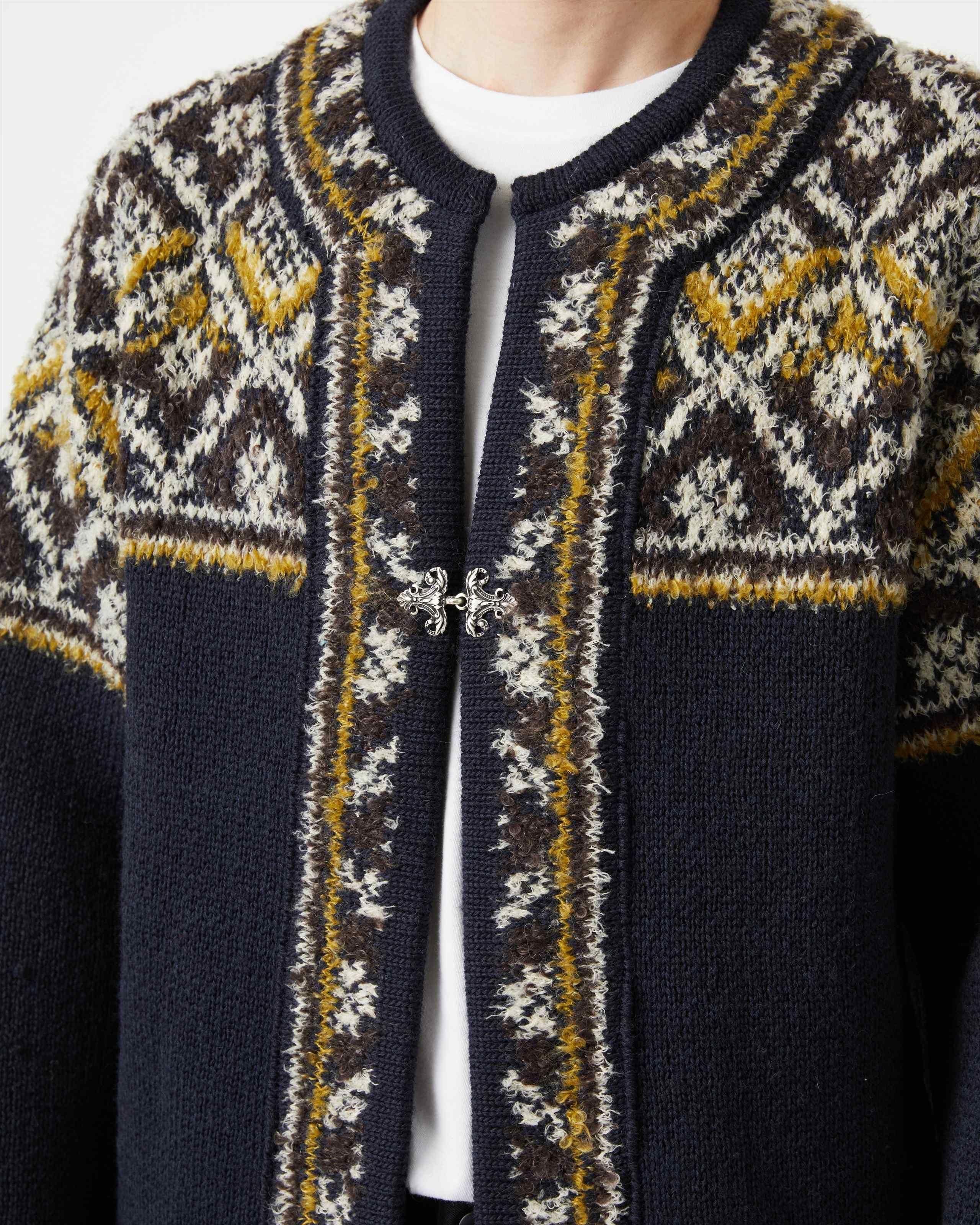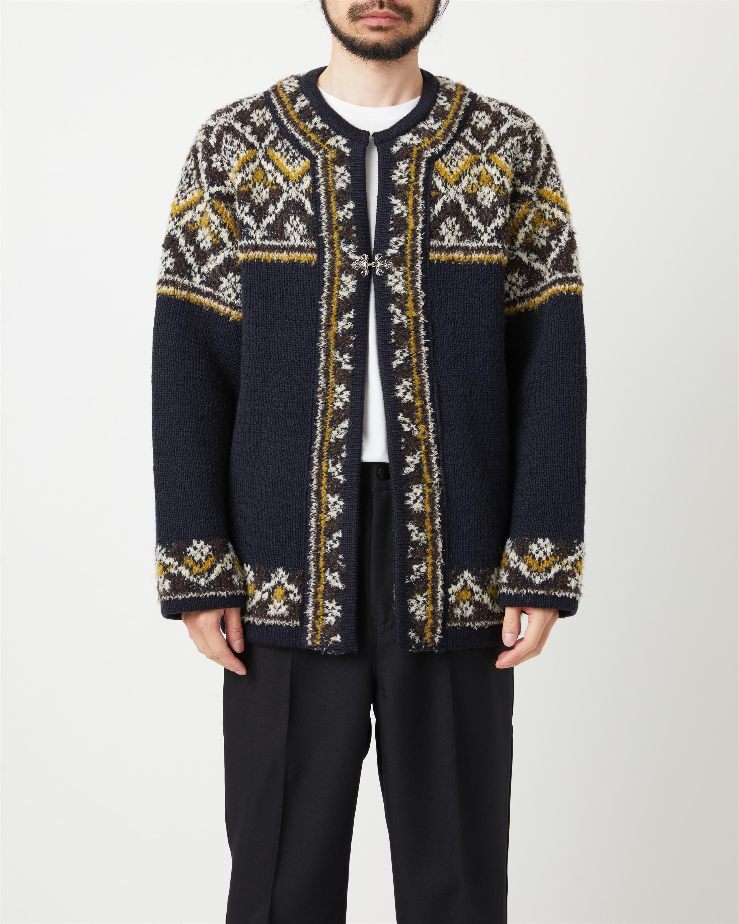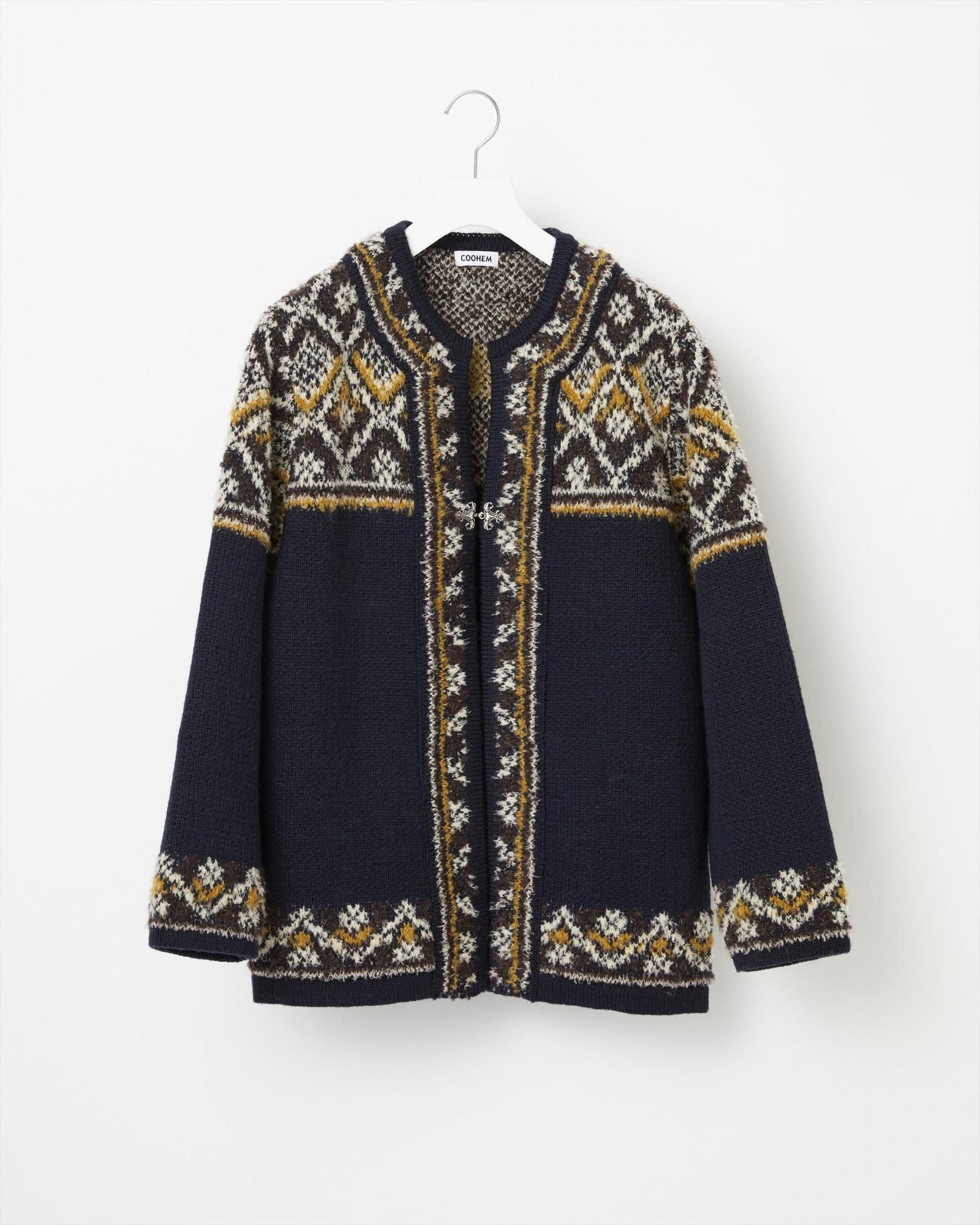 北欧の伝統的なニットカーディガンをブランドらしいユニークな糸使いで表現した、ライトアウターウエア。 ジャガード編みによる適度な厚みとハリ、ソフトな風合いと伸縮性が特徴です。