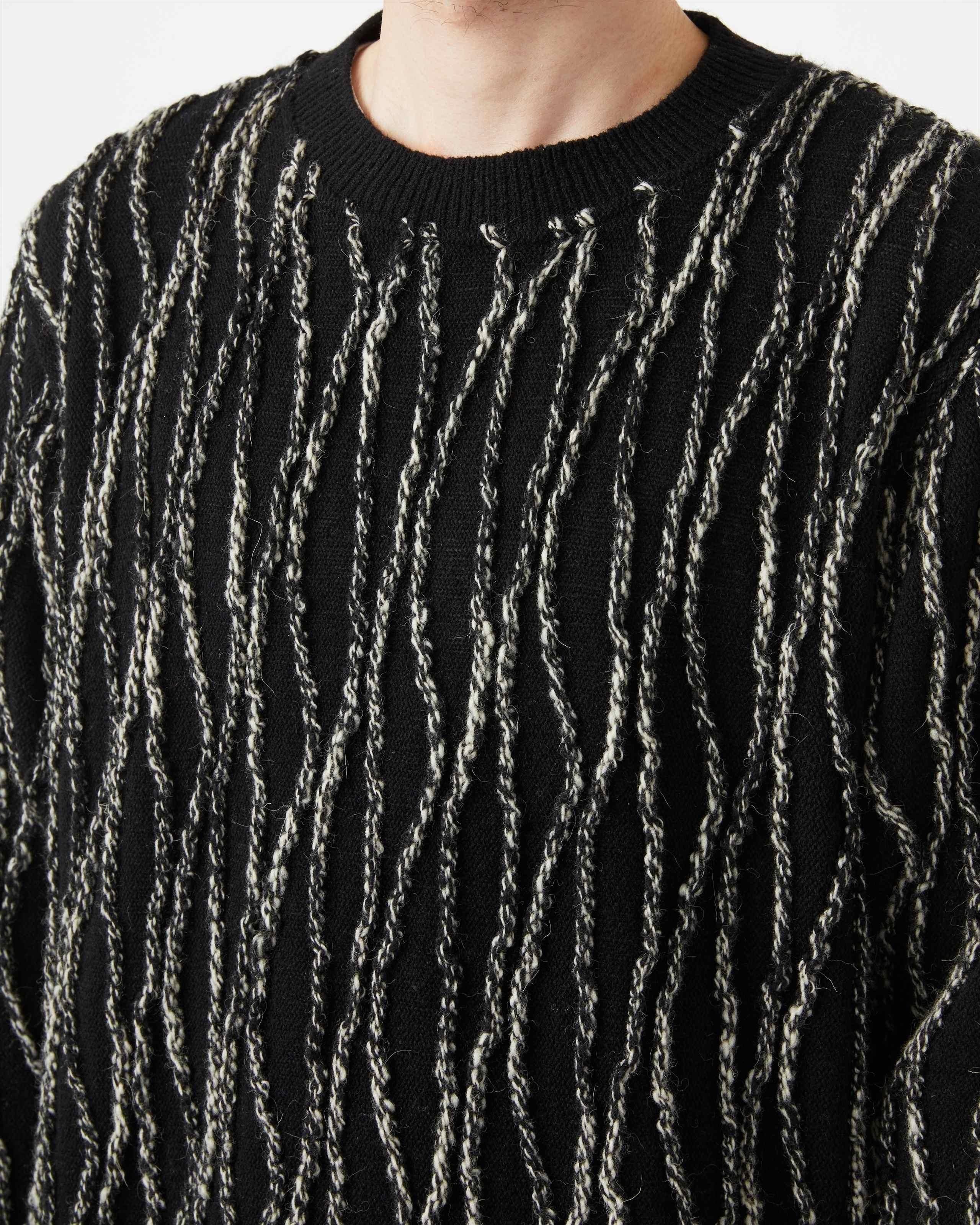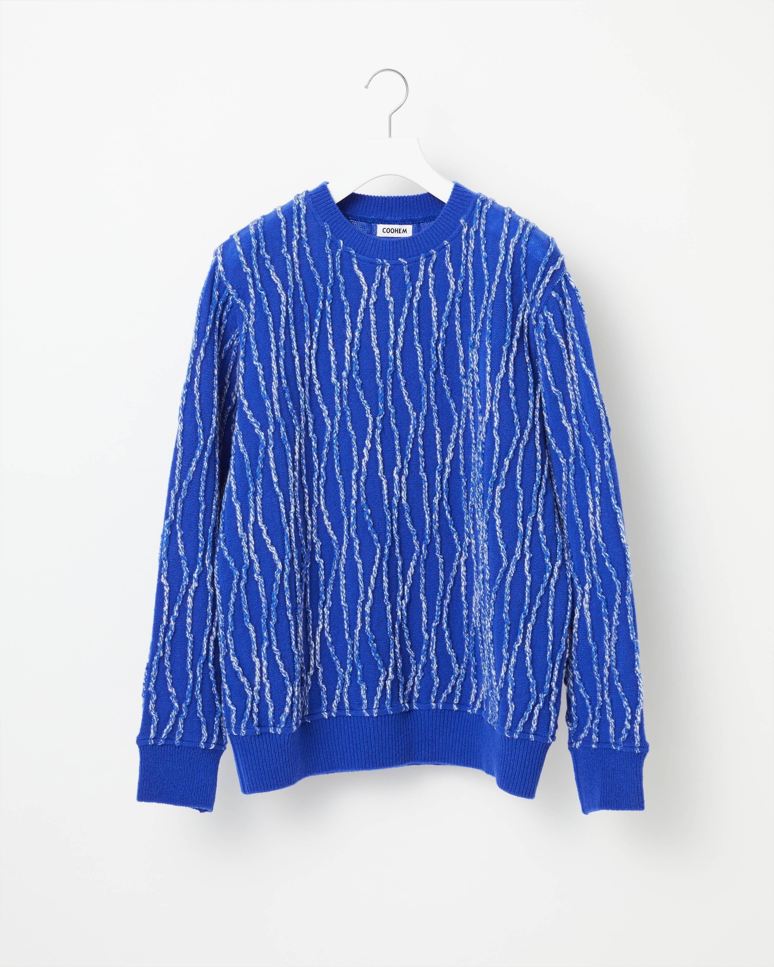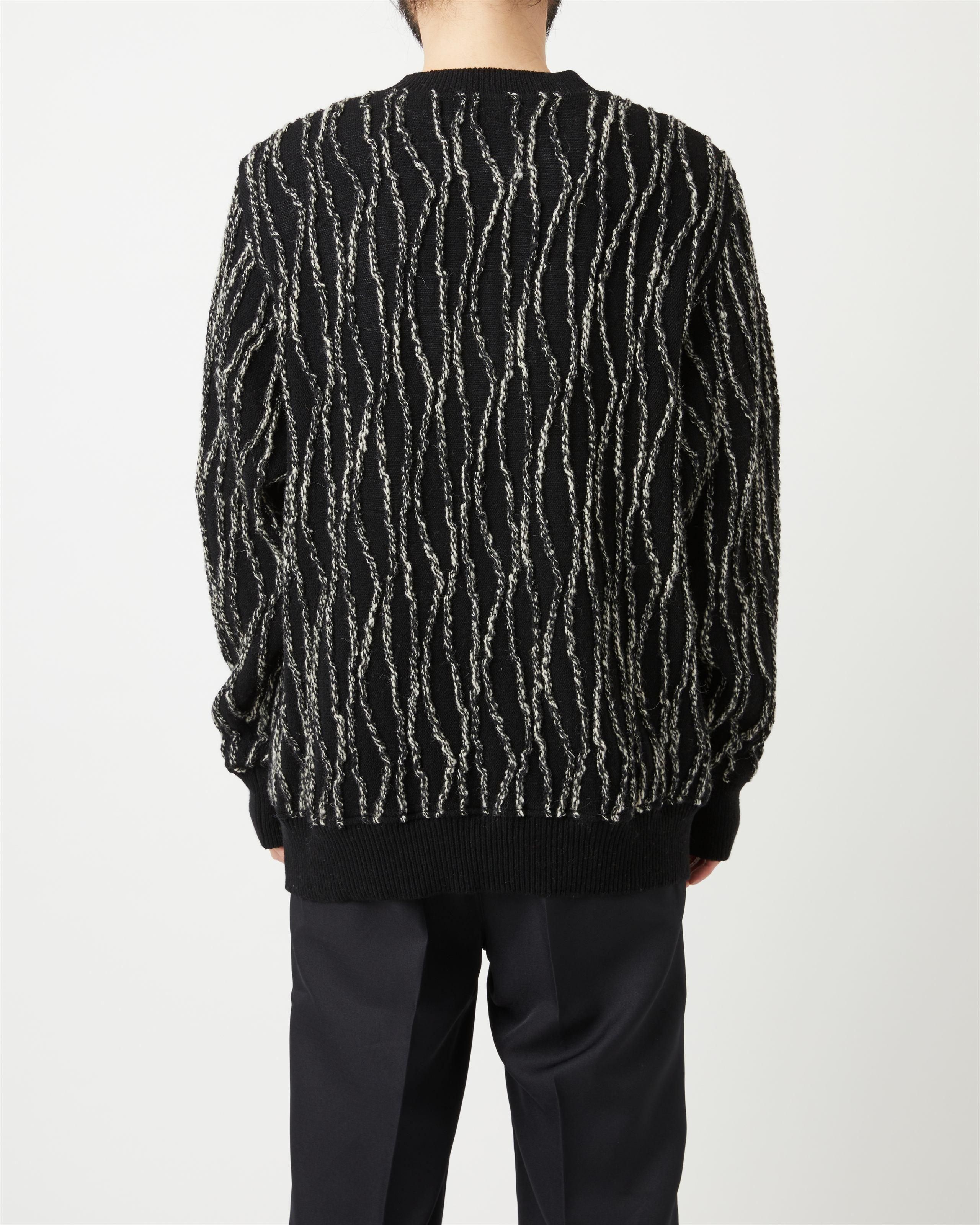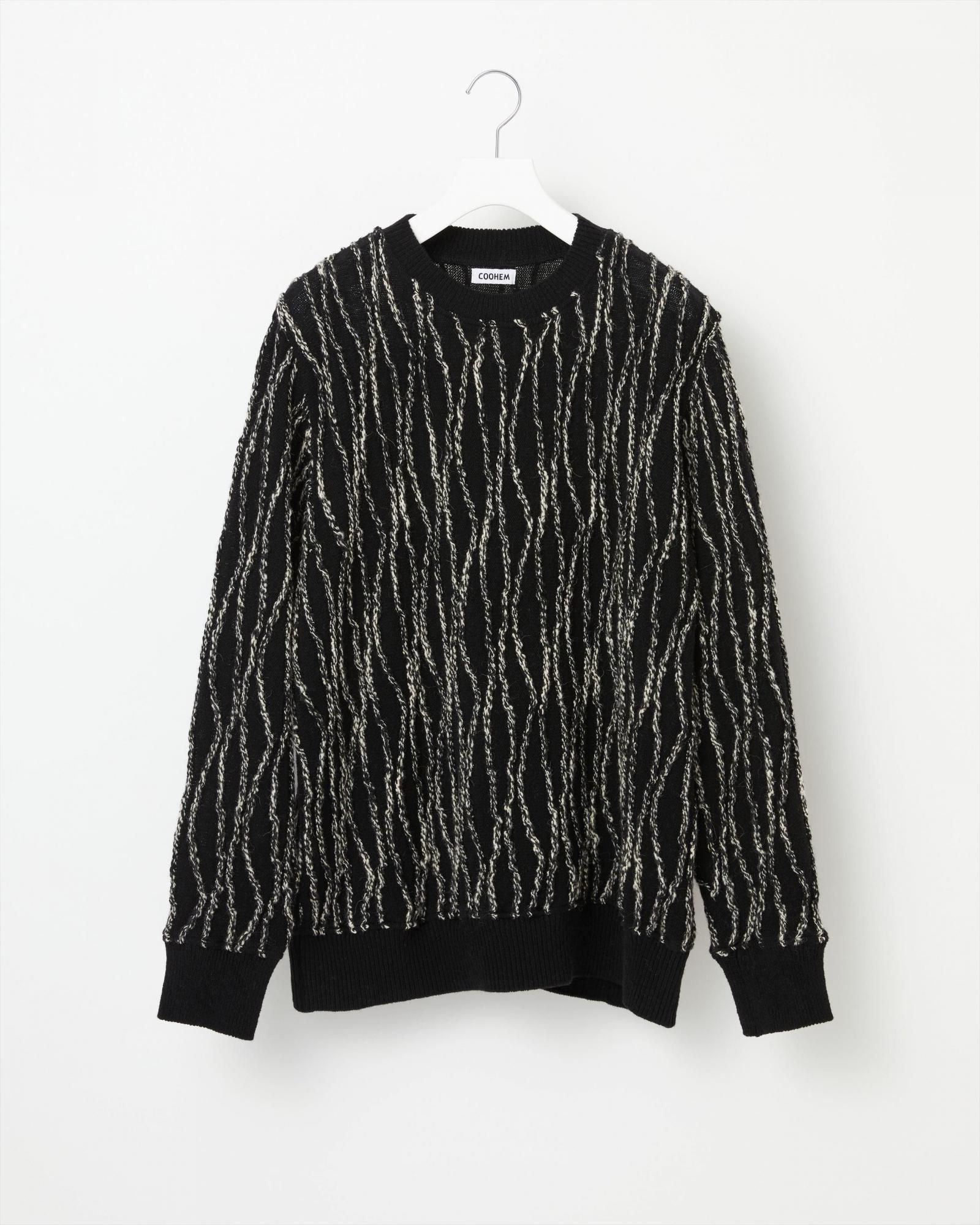 立体的かつ有機的な縦縞柄は、交編のテクニックの一つであるインレイ編みを用いたもの。 ベースにはオーストラリア産のラムウールを使い、軽く柔らかな着心地です。