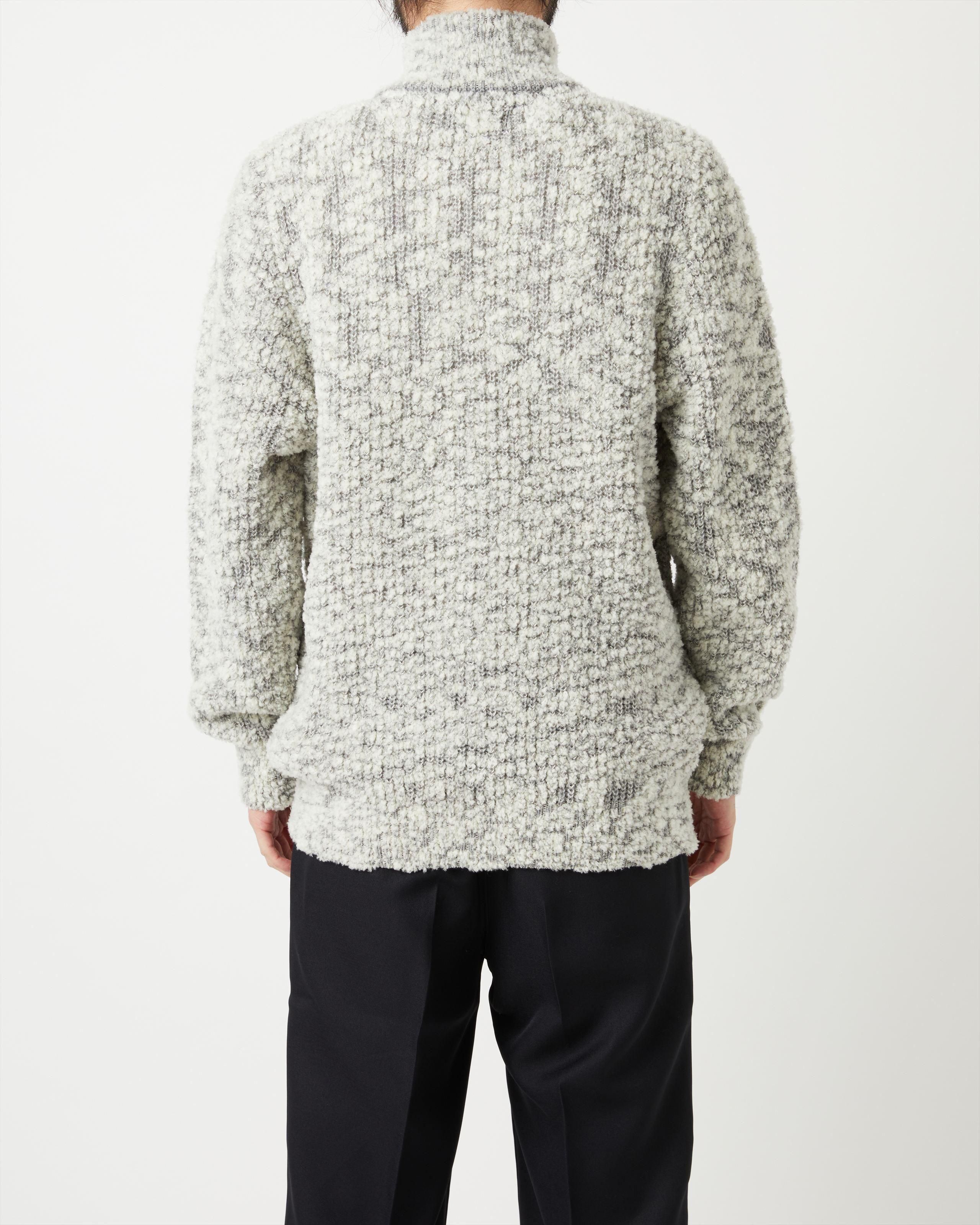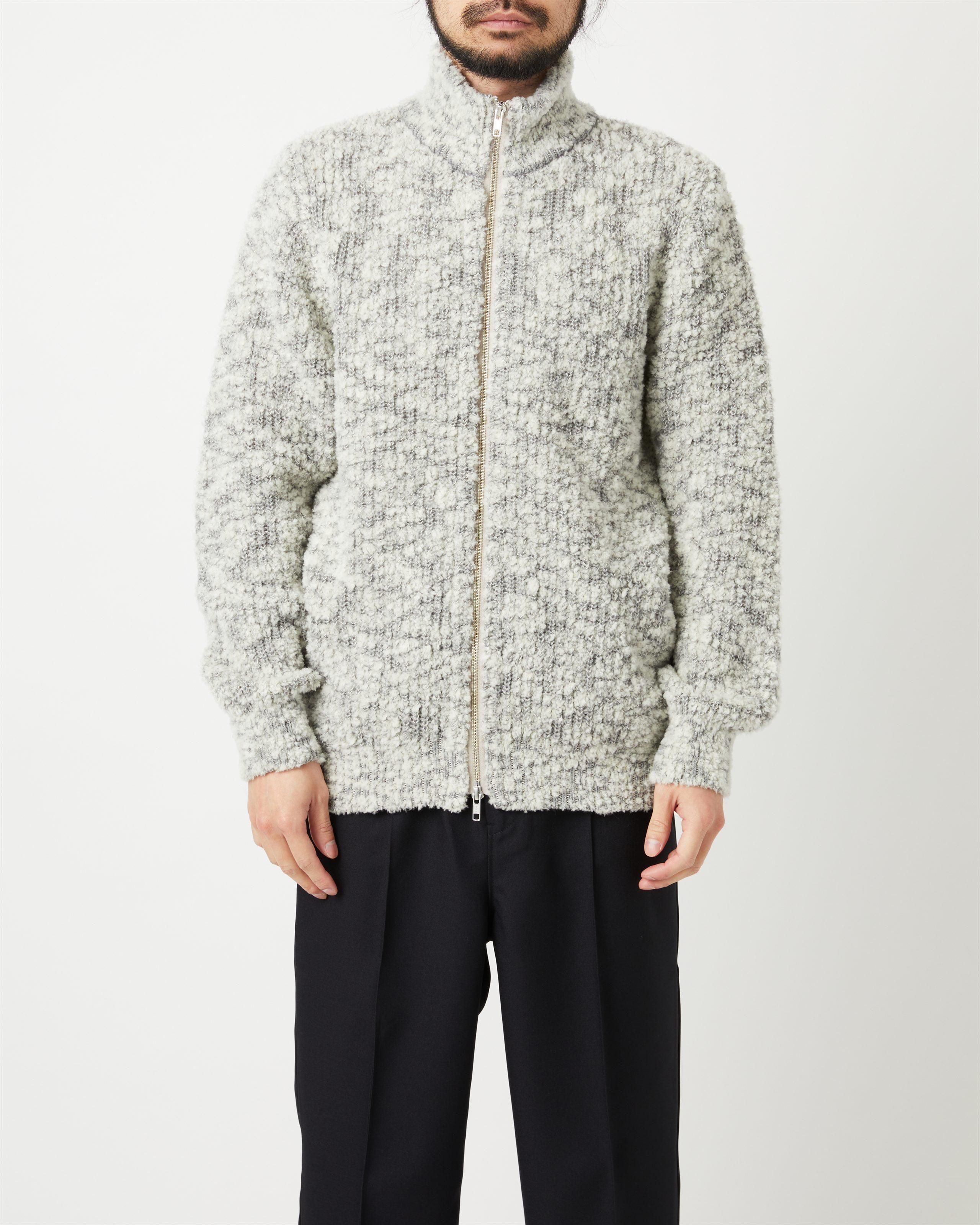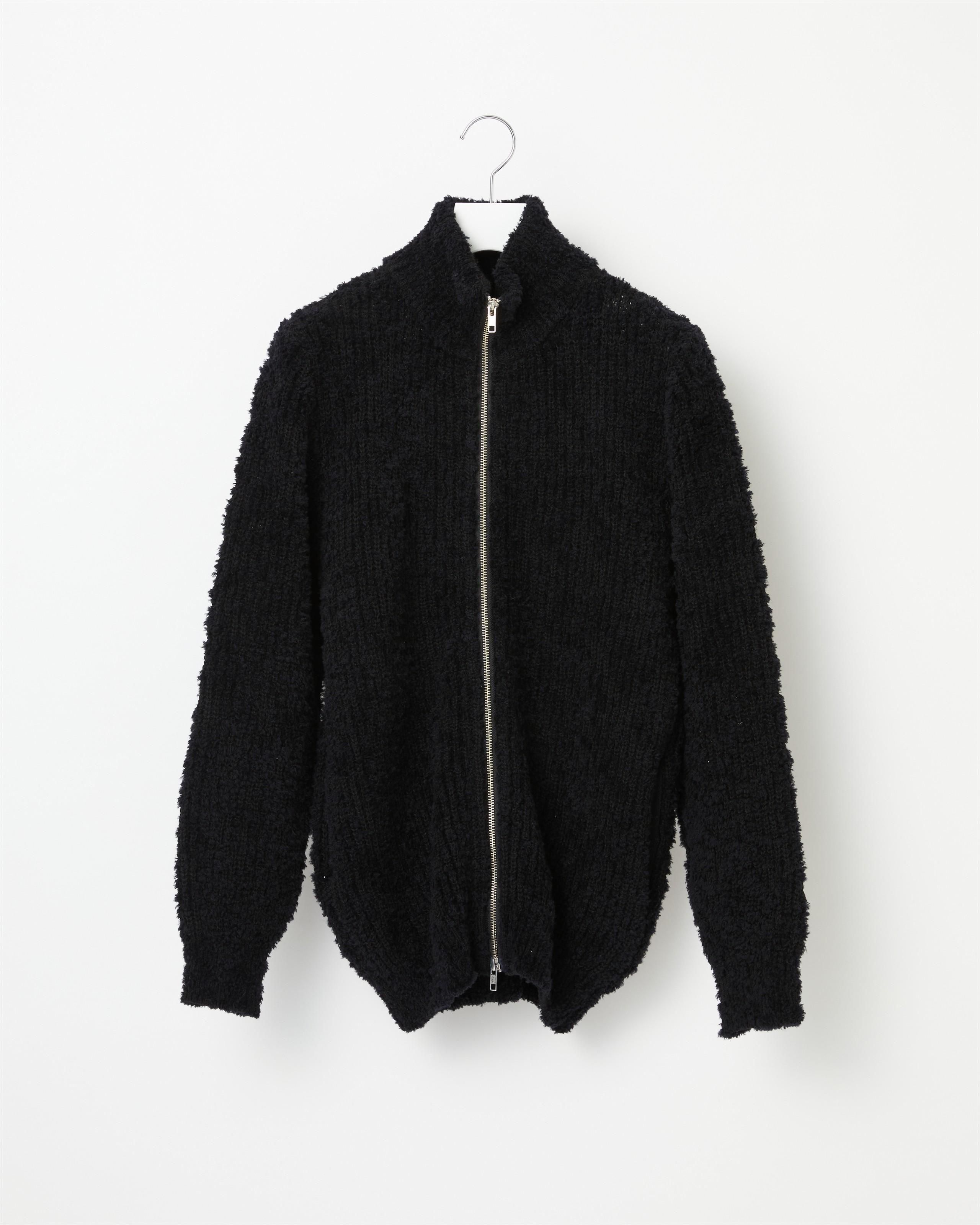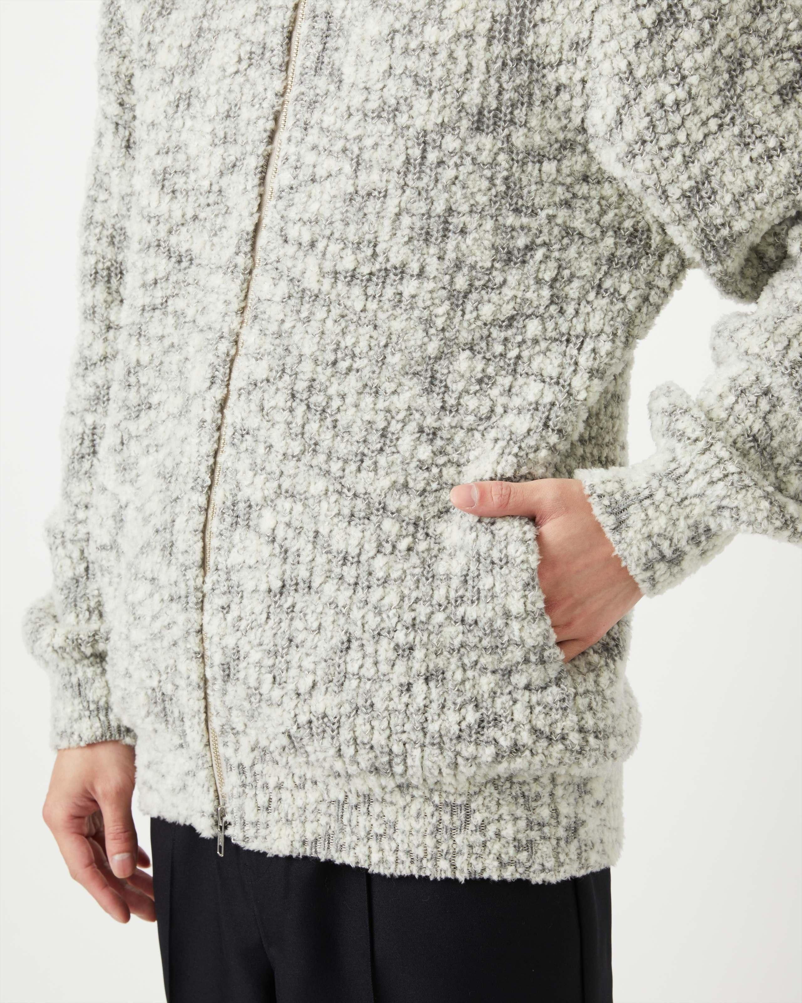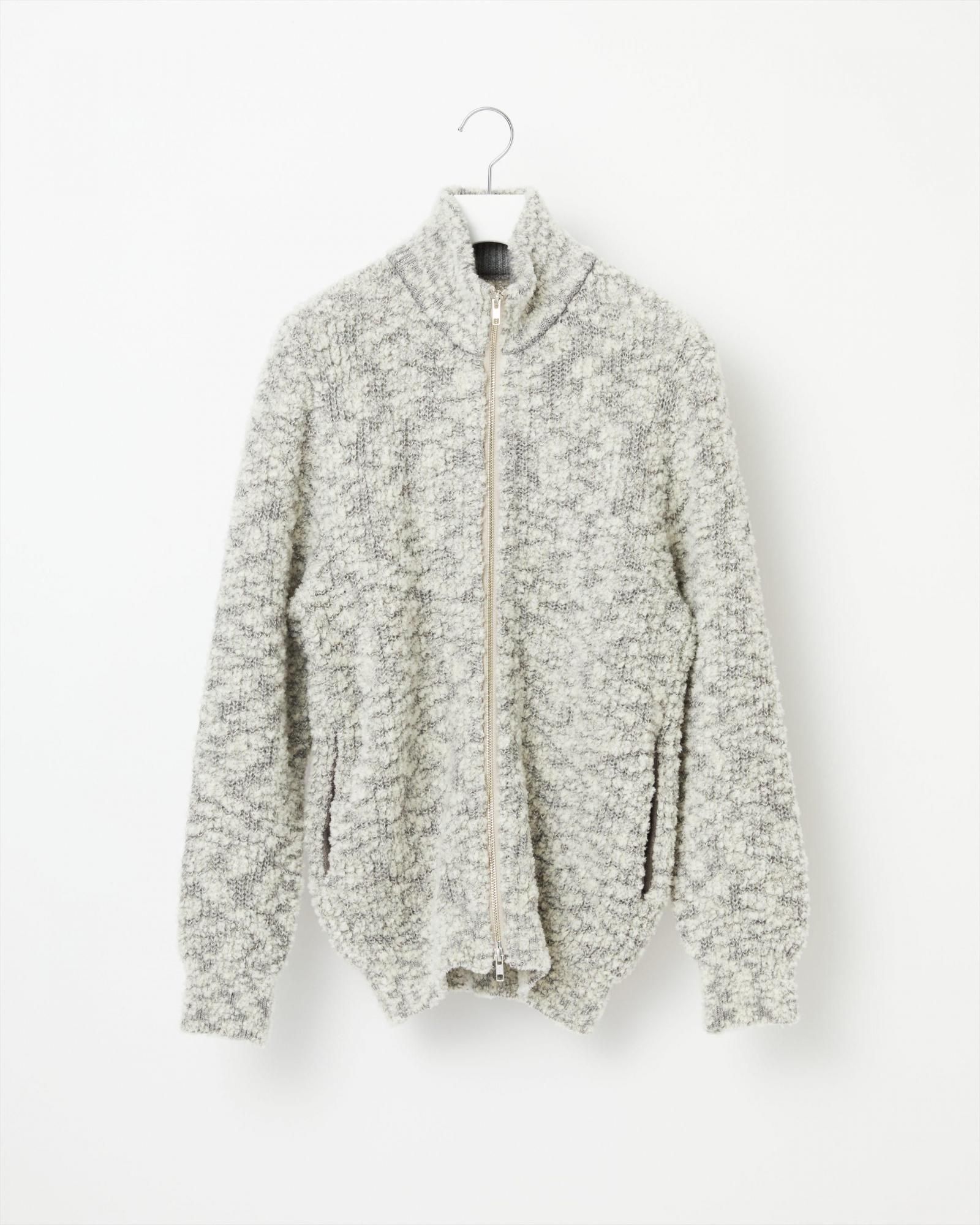 上質なカシミヤ糸とウールモール・シルクを引き揃え、ユニークなテクスチャーのニットテキスタイルを開発。 ファーを思わせるボリューム感と素材のもつ天然の光沢とツヤ、保温性、しっとりとした質感が特徴です。