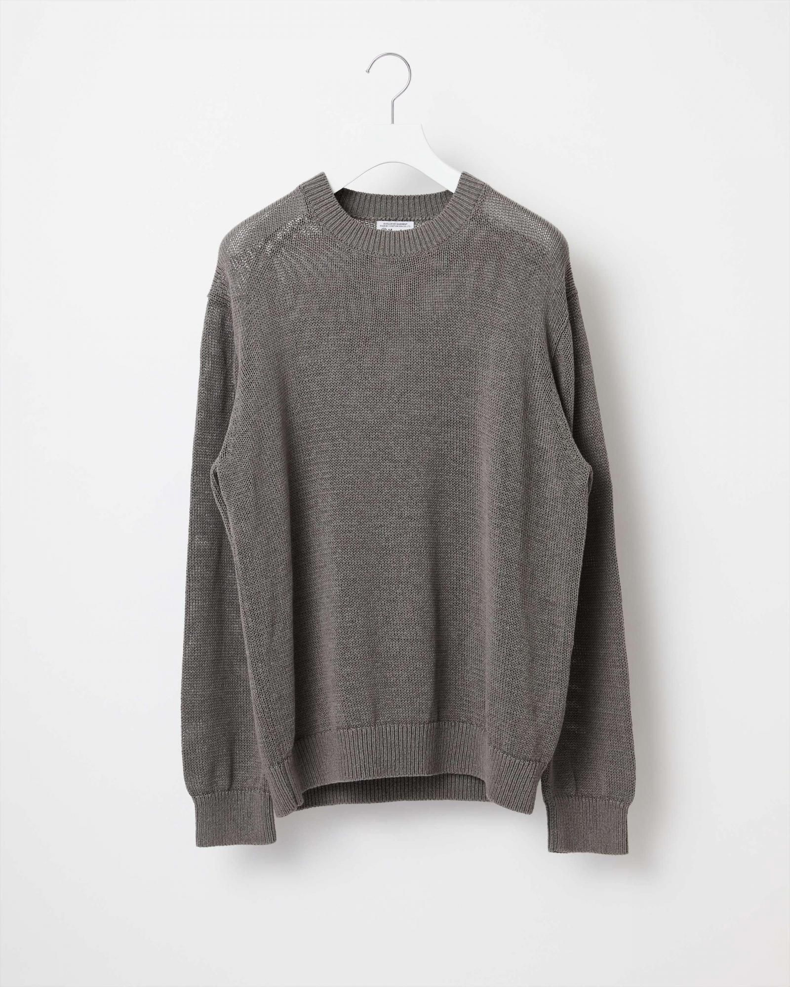 和紙と超長綿をミックスしたテープヤーンを使用。特殊な機台を使い、和紙を上質な超長綿で包み込む様にして作られています。立体感のある編み組織に対して、驚くような軽さと、さらっとした質感が特徴です。